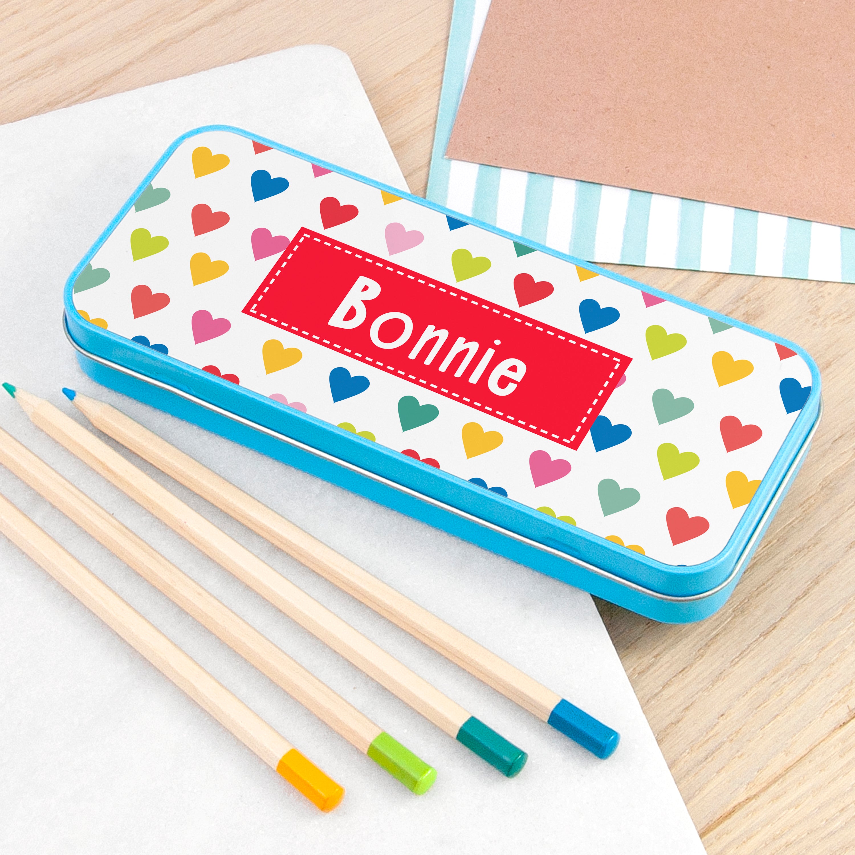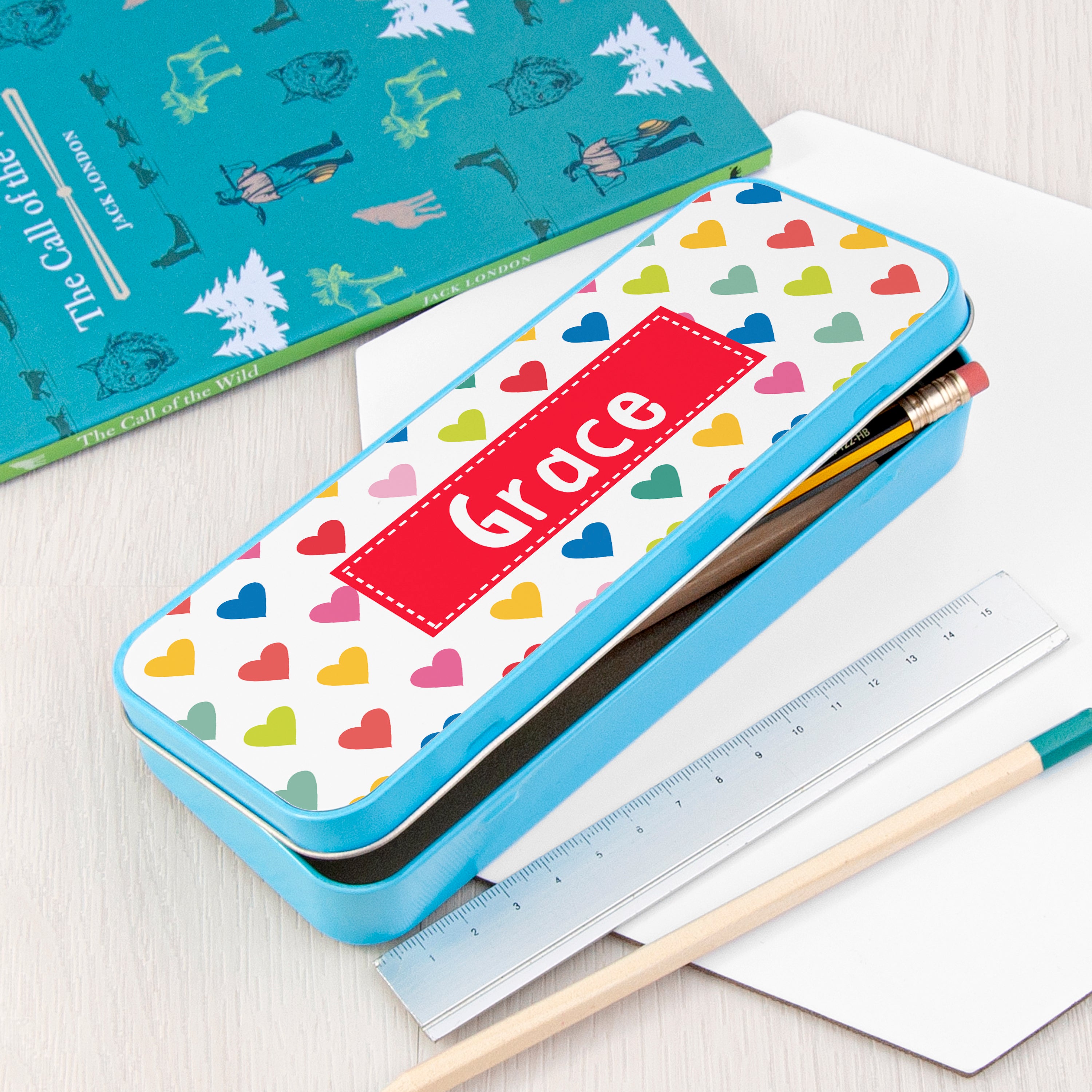 Choose one of four gorgeous designs of her patterned blue pencil case tin: Floral, Floral Stripe, Hearts or Spots.