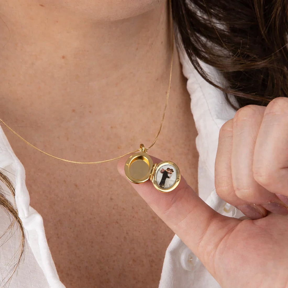The oval form is clean and minimal, with gently rounded edges and a seamless profile that sits gracefully against the neckline. A discreet hinge along the side allows the locket to open smoothly, revealing a small compartment inside where a meaningful photograph or tiny keepsake may be placed. While we do not add the photo ourselves, the locket is designed so you can insert a cherished image before gifting, transforming it into a truly personal and heartfelt piece.