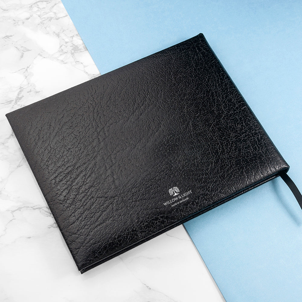 The death of a loved one is such a difficult and emotional time. Why not share your precious memories of them in our luxury personalised black leather memoriam book as a tasteful reminder of what made them so special to everyone they encountered? All our beautiful leather memoriam books are made by hand in the United Kingdom from luxurious vintage hide Italian leather for an assured quality finish.