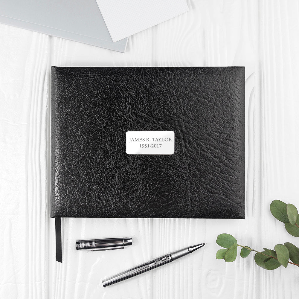 Personalise with their name and perhaps a short message, favourite memory or their birth and death years. Our specialist craftsmen will then professionally engrave it onto your elegant leather memoriam book for people to share their fond memories in at a highly emotional funeral reception.