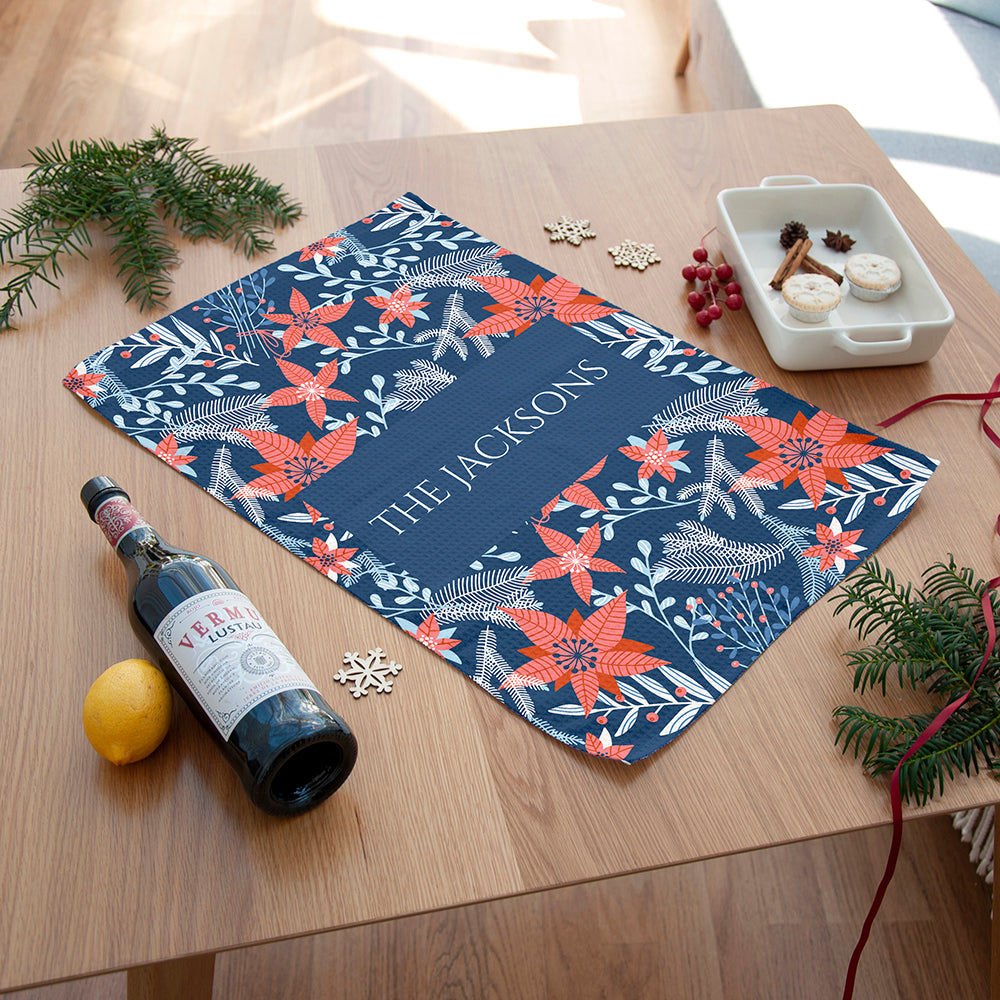 Personalised Christmas Red Floral Wallpaper Tea Towel