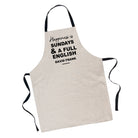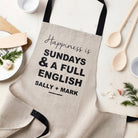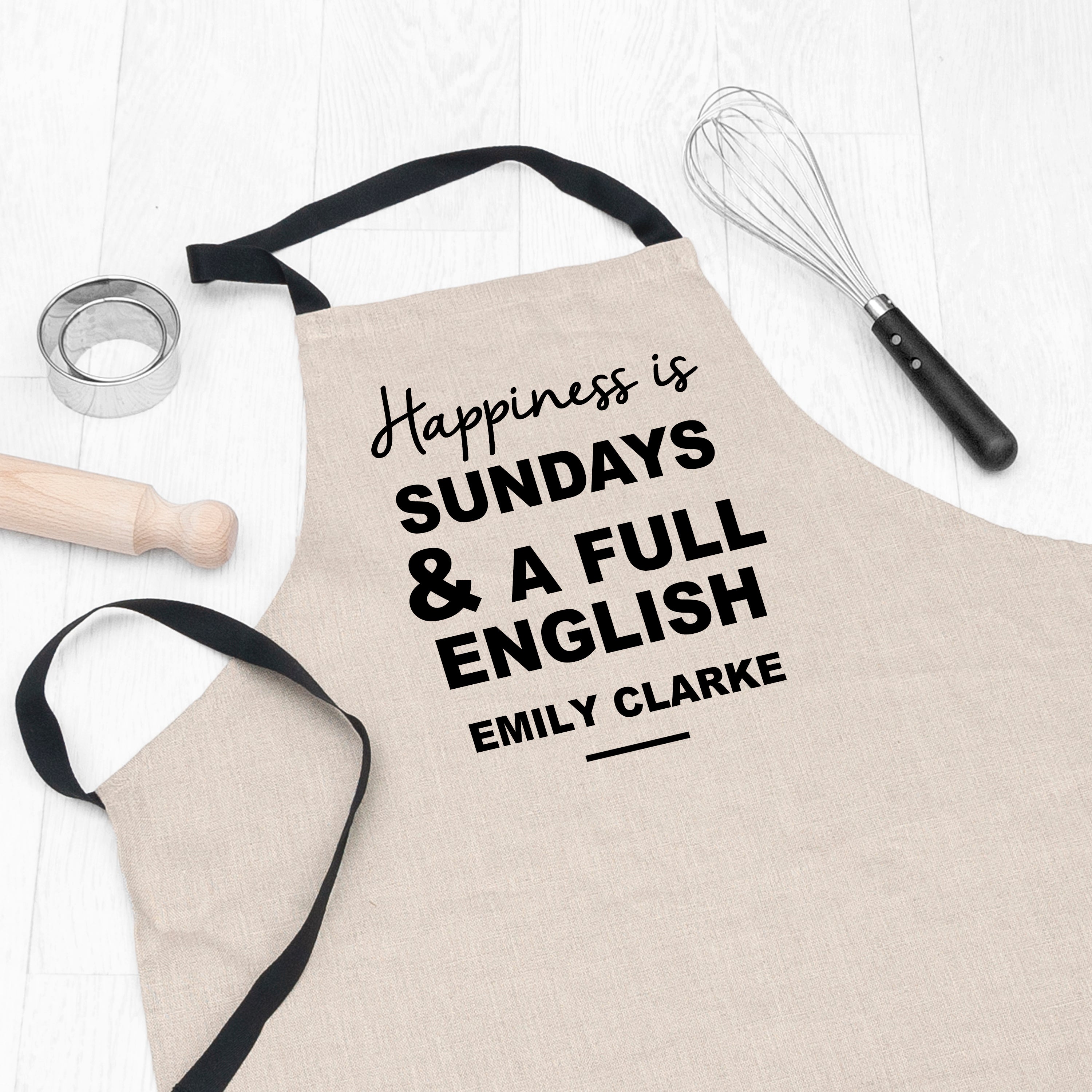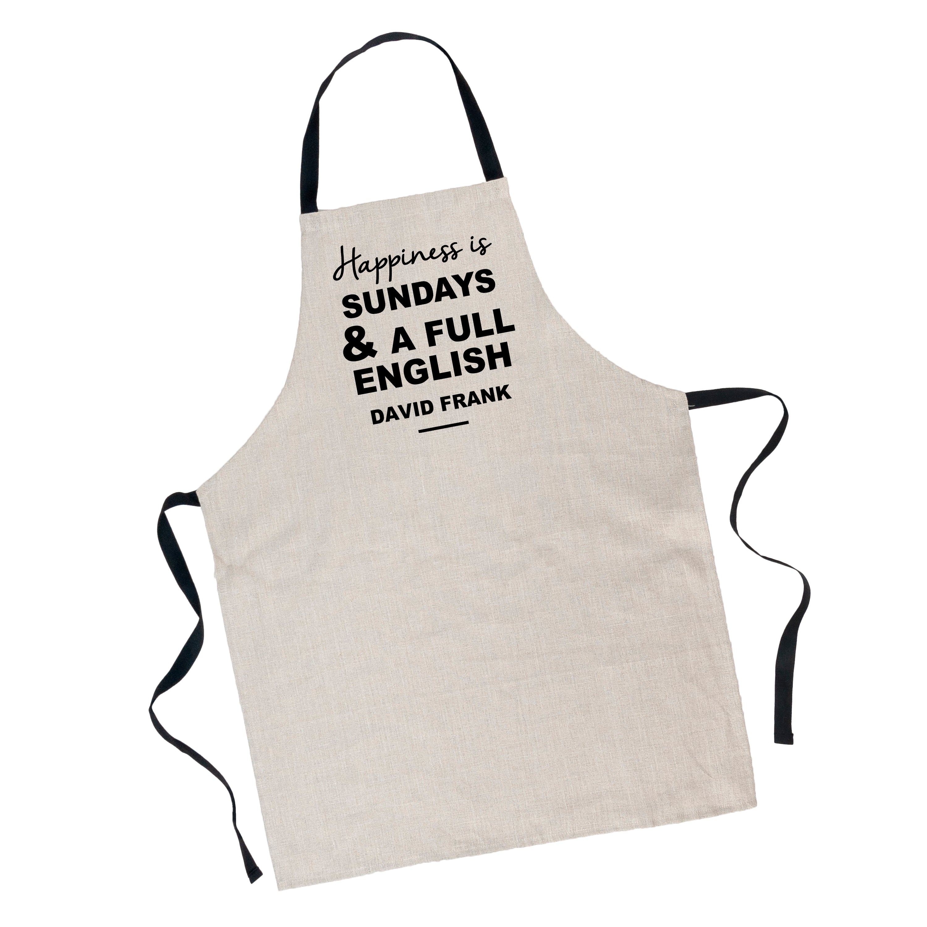This apron is made from a strong protective natural linen cloth with generous ties and neck loop in a smart contrasting black. ‘Happiness is’ comes as a standard text in a script font, whilst underneath in bold 'Sundays & a full English' will be written in black capital letters.