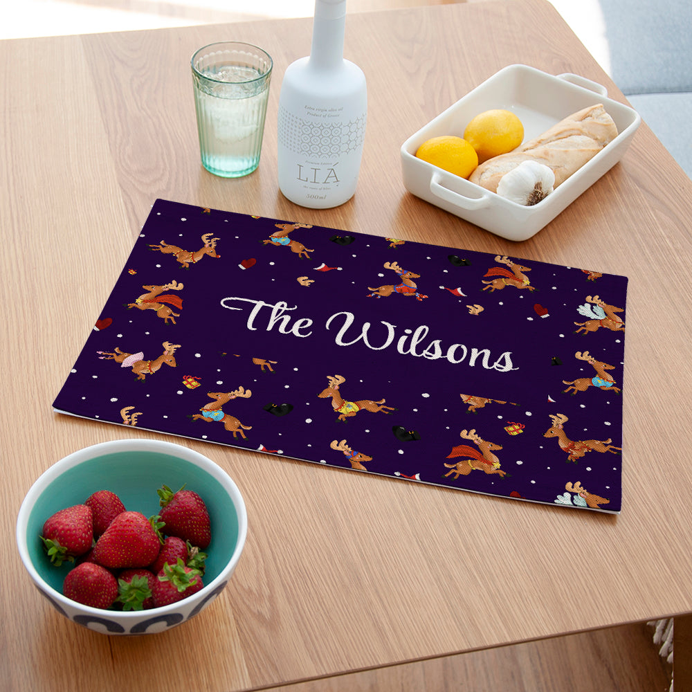 This linen placemat is decorated with a festive reindeer pattern, featuring images of Santa’s reindeers interspersed with various Chrismassy and wintery iconography on a purple background. ‘The [Surname]s’ comes as standard text.