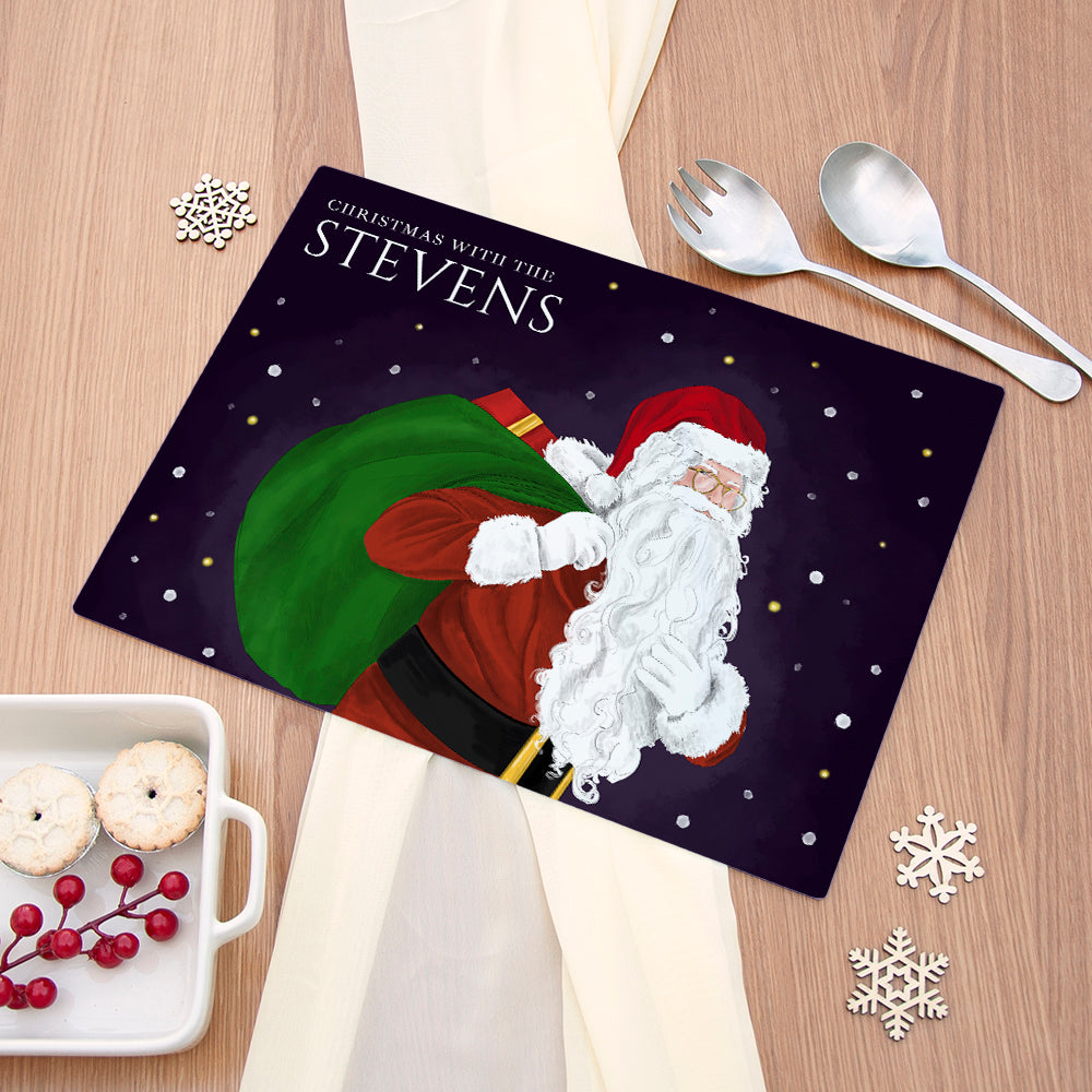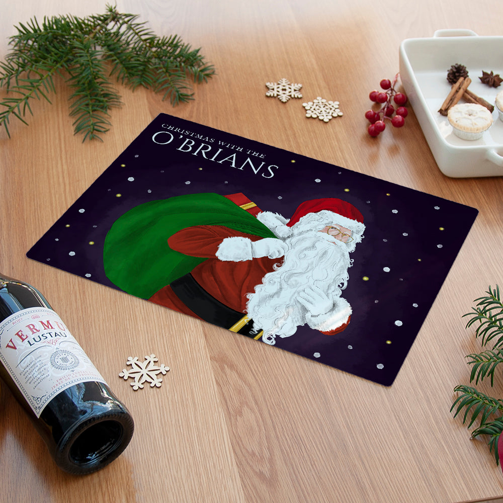 This sleek chopping board features a traditional image of Santa Claus carrying a sack of presents on a snowy Christmas Eve evening. ‘Christmas with the [Surname]s’ comes as standard text with this design.