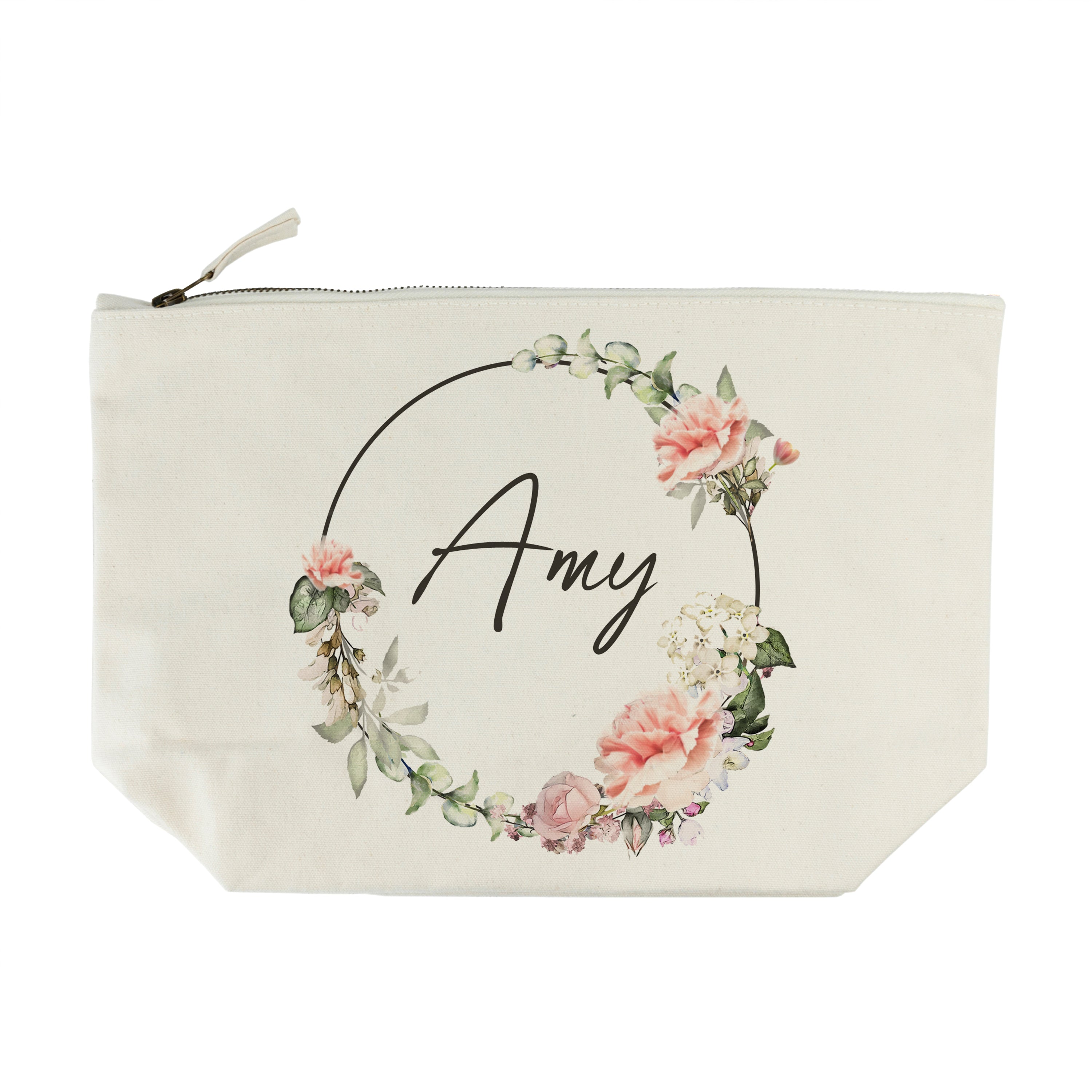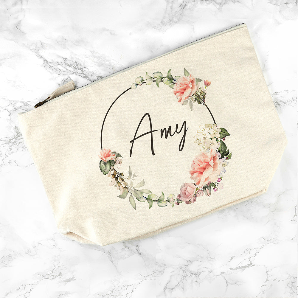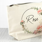 Our luxury handcrafted cosmetic bag can be personalised by adding her name and our specialist team will meticulously print it onto her stunning zip-up cream cosmetic bag for her, creating a high-quality cosmetic bag she is bound to cherish forever. As part of the design, her name will be surrounded by a chic wreath design as standard.