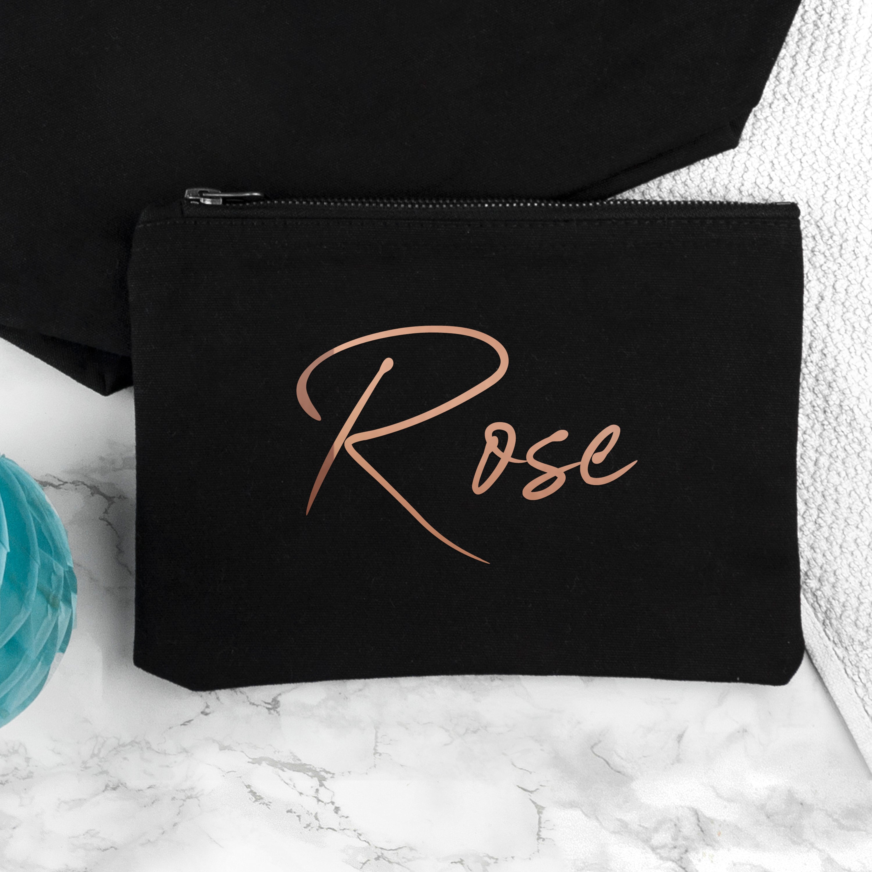Our beautiful black zip up makeup bag will feature your loved one's name in a large script-style font to prominently show it's theirs. To make it pop even more on the black background, their name will be written in a stunning rose gold that's guaranteed to wow.