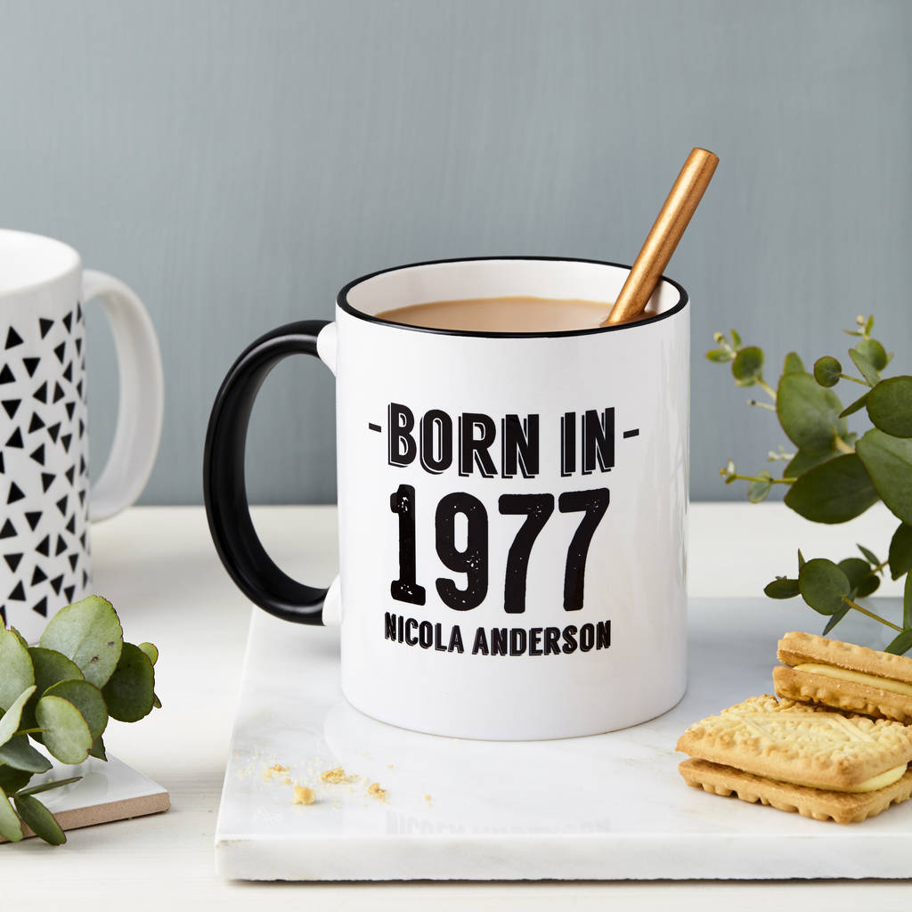 This stylish white ceramic mug comes with the standard text ‘Born in [Year]’ followed by your loved one’s name. All elements of the design will be written in big bold black capital letters, so everyone knows which year they’re born in! The handle and rim of the mug are black.