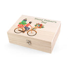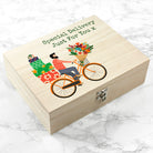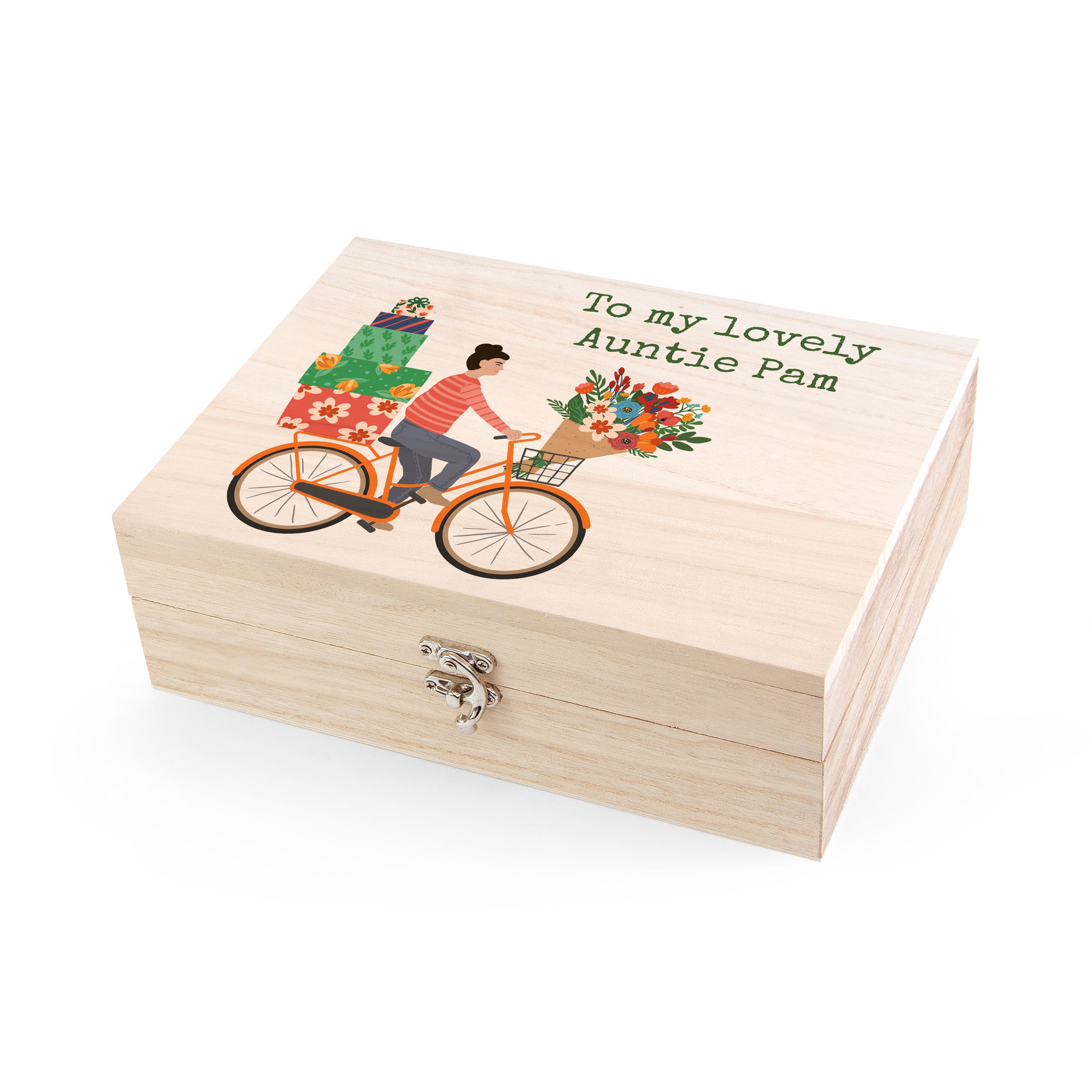 Your personalisation will come in as green typewriter style text at the top right hand side of the design. The head turning image is of a cyclist riding an orange bike with a bunch of flowers in the front basket and a huge stack of presents behind them - a truly special delivery!