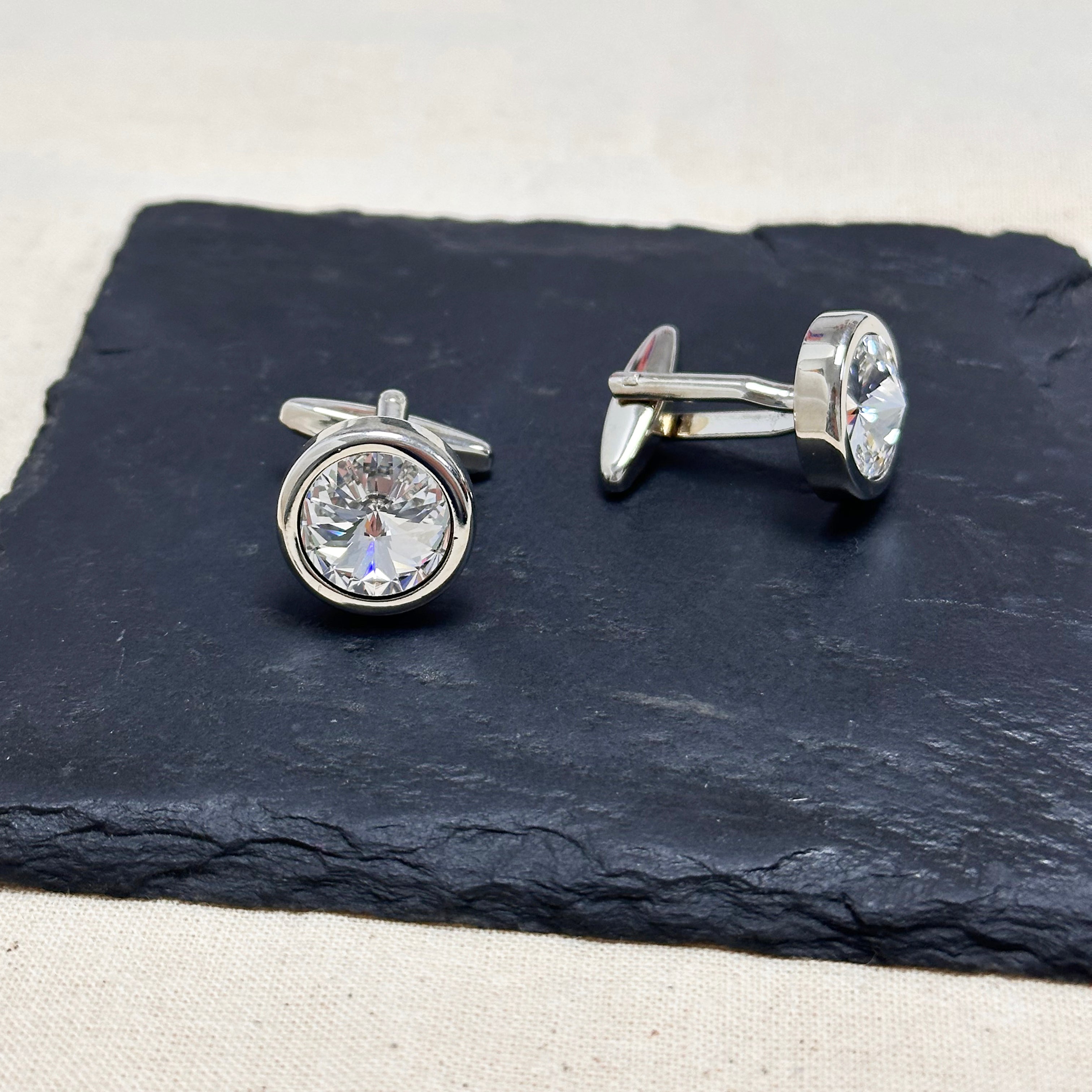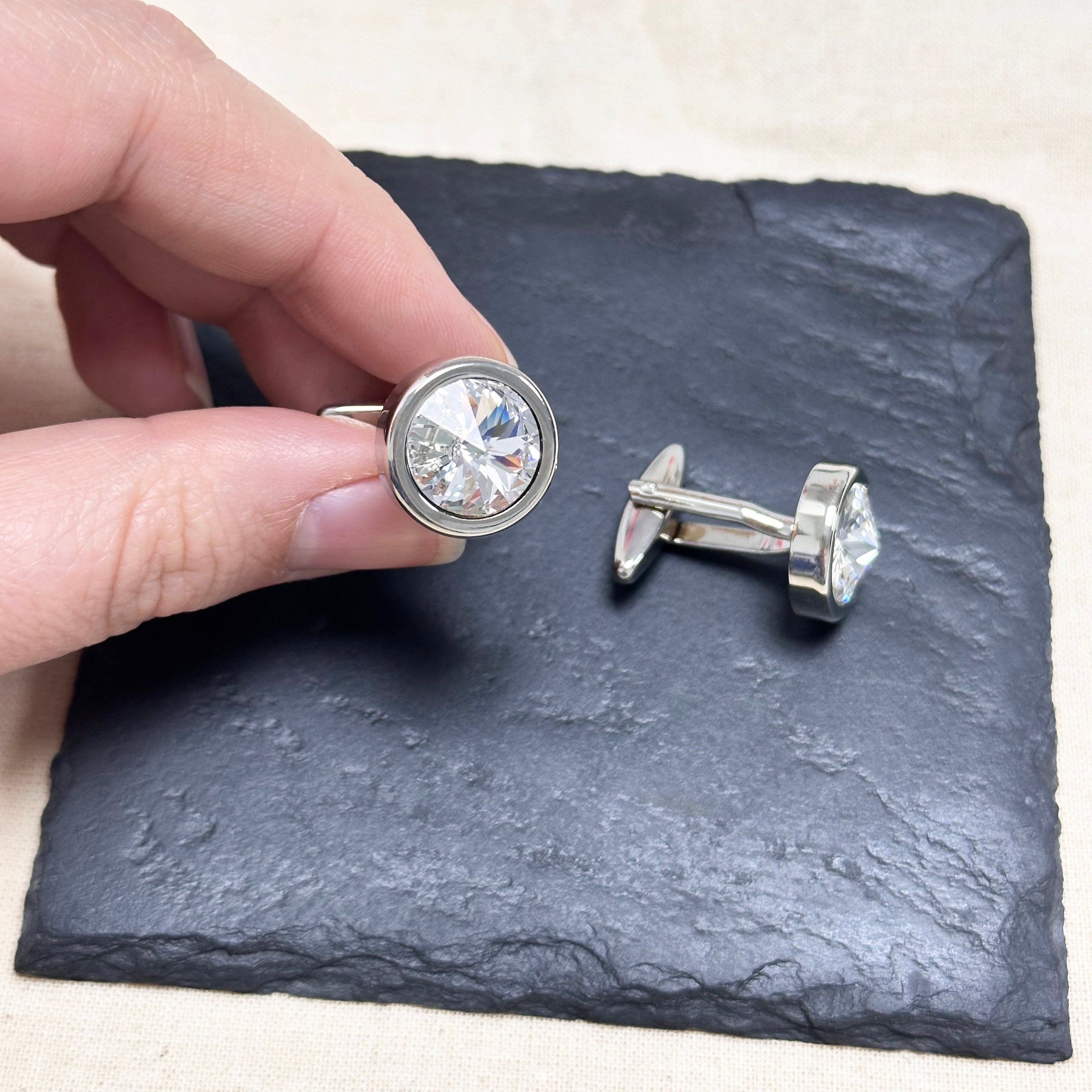 The sleek silver-tone casing encircles the crystal with elegant symmetry, offering a smooth, mirror-like finish that complements the clarity of the stone. The minimalist round setting is designed to highlight the crystal’s natural radiance, ensuring that the focus remains on its brilliance and depth. The metalwork, with its clean lines and lustrous polish, exudes durability and class, making these cufflinks suitable for both occasional wear and regular use.