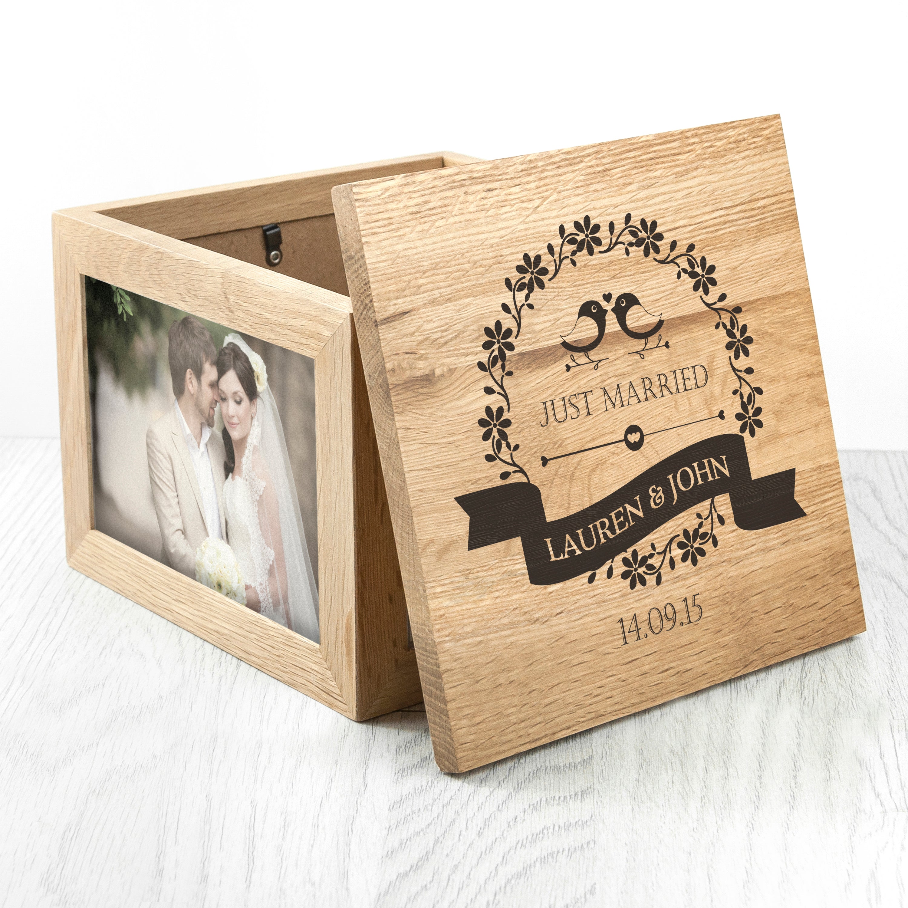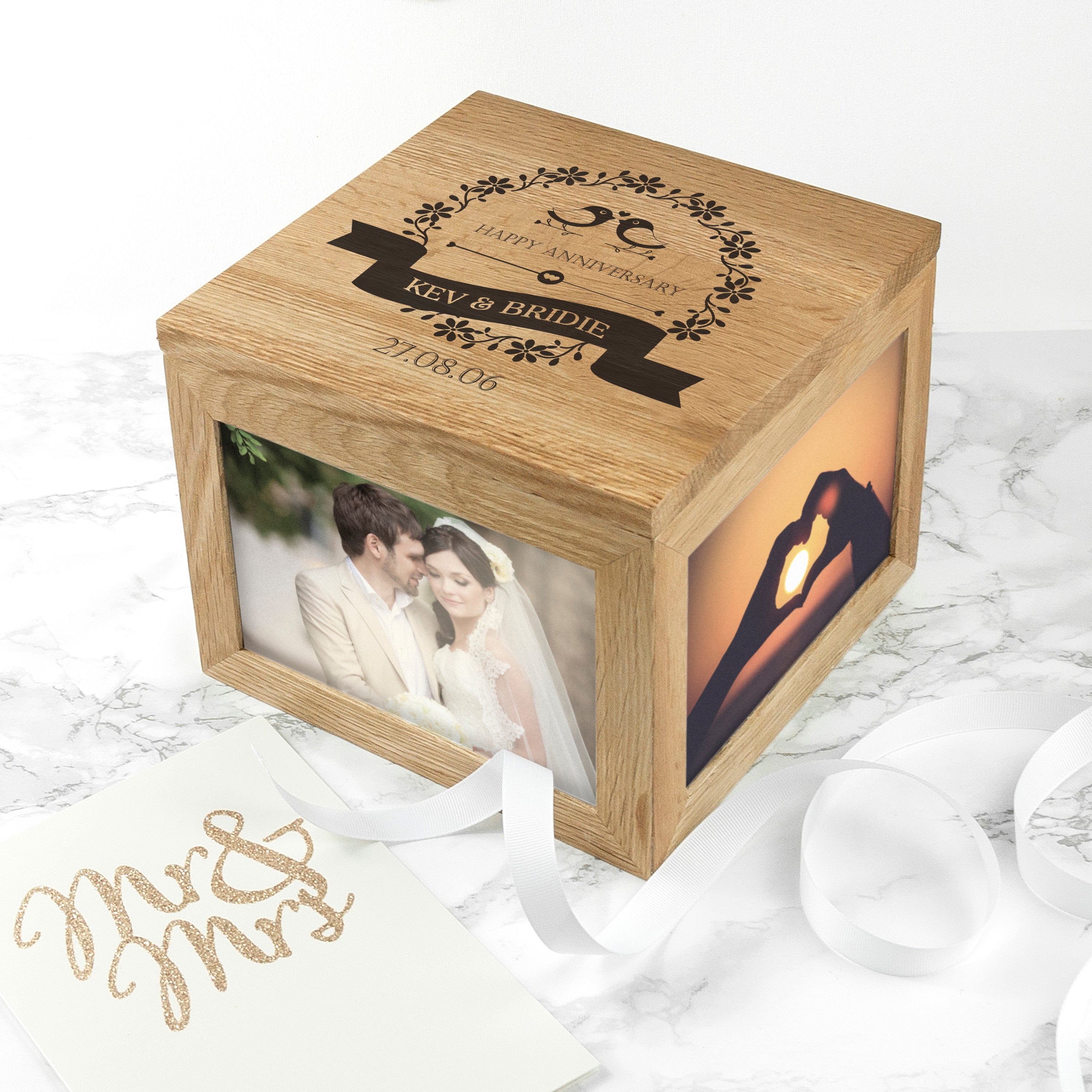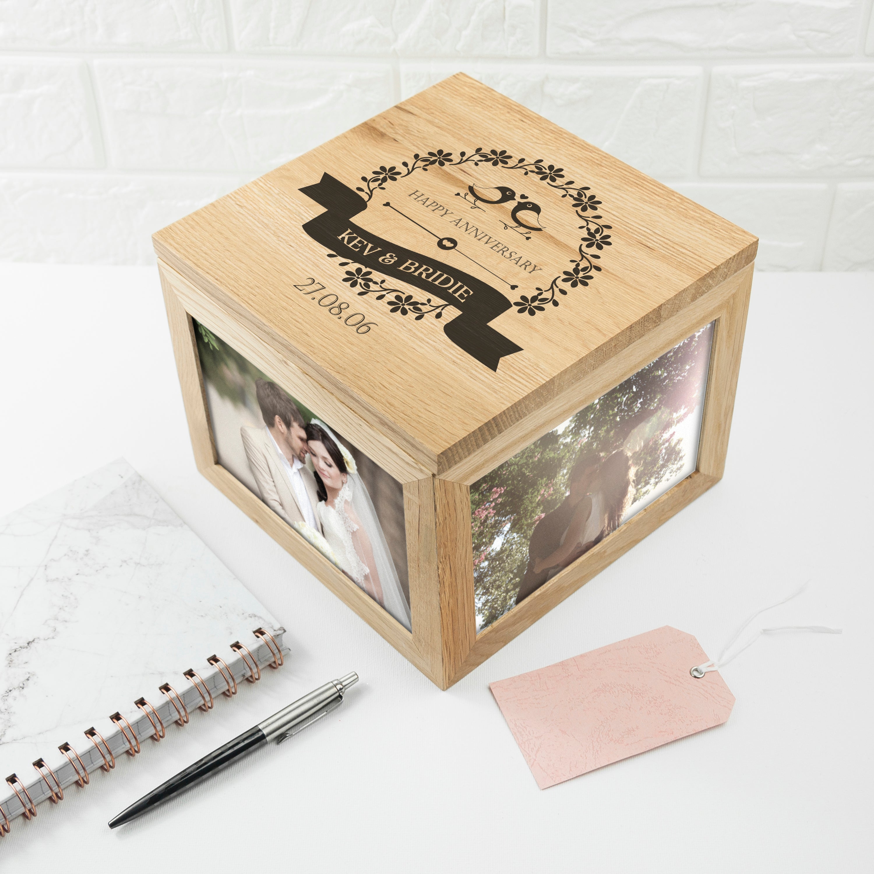 Our exquisite Personalised Love Birds Oak Photo Keepsake Box is a timeless piece, thoughtfully designed to celebrate love, commitment and cherished memories. Crafted from solid oak, it exudes natural warmth and durability, making it a gift that will be treasured for years to come. Perfectly suited to newlyweds or couples celebrating a milestone, this premium keepsake box doubles as both a striking photo frame and a practical storage solution, elegantly combining sentiment with functionality.