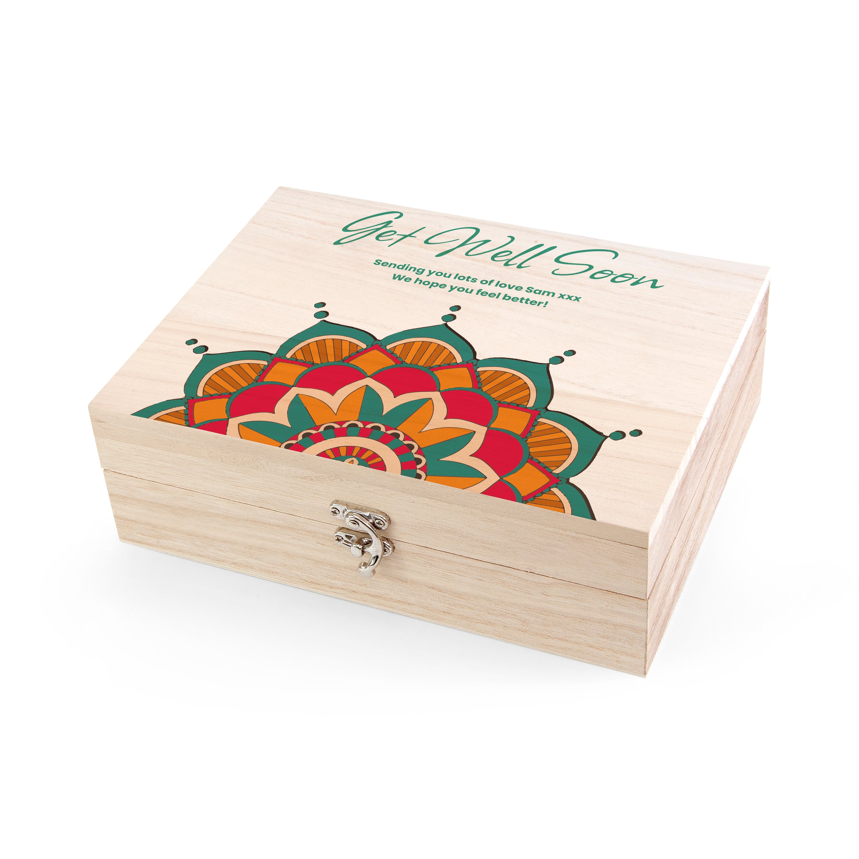 A vibrant and colourful mandala design provides the focal point for your stunning snack box. On top of which your personalisation will be printed. The top line will come in a green coloured script font, whilst the bottom two lines of the personalisation in the same greeny blue, but this time will be in a standard text font.