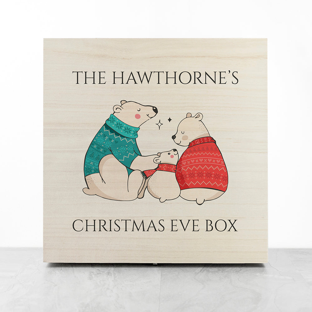 Transport your little one to the North Pole this Christmas with our gorgeous, handcrafted personalised polar bear Christmas box. A magical and ultra-meaningful gift, that your loved one will treasure forever. A cute family of polar bears will appear in the centre of this Arctic-themed design.