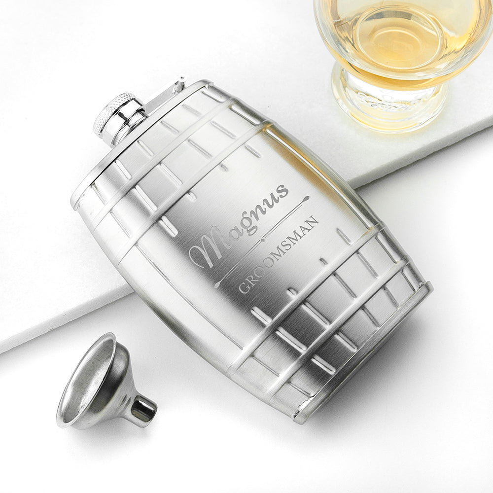 In the shape of a cask, our personalised hip flask is fun and eye-catching! A contemporary hip flask which can be personalised with a name to make a special gift for that stylish gentleman.