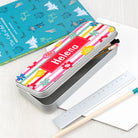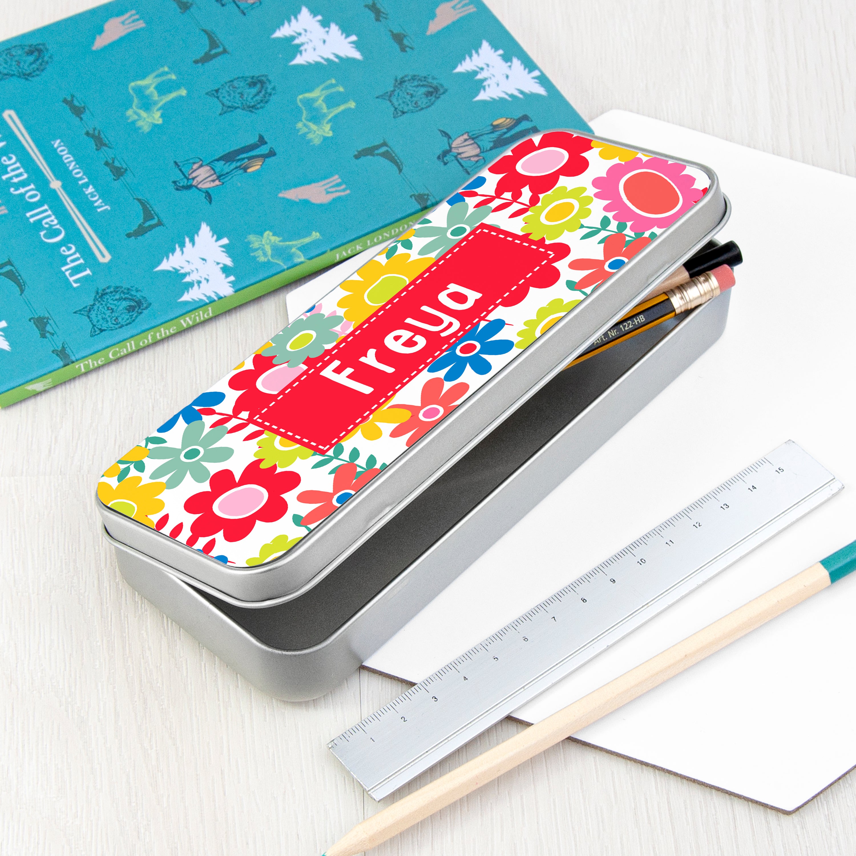 Our sleek and stylish personalised girl's patterned pencil case tin is sure to take pride of place on her school desk or bedroom study table. It'd make a fun and practical birthday, Christmas or back-to-school gift for her. Perfect size to fit in her backpack, this sturdy pencil case tin is ideal for all her stationery essentials, like pens, pencils, rulers, rubbers, and more. It’ll also keep her belongings nearly stored with its secure lid.