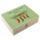 This beautiful wooden vegan snack box features a classy image of a row of Christmas stockings full of Christmassy treats. They appear underneath an elegant festive themed floral display on a green geometric background. ‘Merry Christmas [Name]’ comes as standard in black text with this design, above this gorgeous seasonal scene.