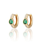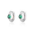 The delicate teardrop design lends these earrings a vintage romantic appeal, their faceted green stones expertly cut to catch and reflect the light with every movement, creating a mesmerising play of sparkle and colour. The surrounding clear crystals enhance this effect, adding refined luminosity and drawing the eye to the rich central gem. Designed as a small huggie hoop, each earring offers a close, secure fit that gracefully hugs the ear, creating a polished, contemporary silhouette that remains comfortable for all-day wear.