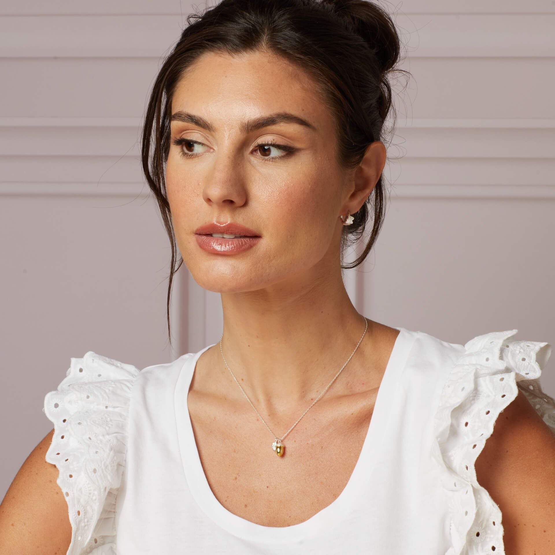 Suspended beautifully from a finely crafted sterling silver chain come two delicate charms that embody the richness of autumn. The first is a softly sculpted oak leaf charm in polished sterling silver, intricately detailed to reflect the gentle texture and movement of nature. Alongside it hangs a radiant yellow gold plated acorn charm, its smooth and lustrous finish offering a warm contrast to the cooler tones of silver.