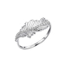The ring features an intricate feather design that flows gracefully across the top half of the band. Each feather is meticulously detailed, with delicate, flowing lines that echo the airy movement found in nature and in the original print. The arrangement follows a subtle curve, creating a sense of motion and elegance that wraps naturally around the finger. A row of white cubic zirconia stones runs along the centre of the feather for its entire length, catching the light with a soft shimmer and lending a refined touch of radiance to the piece.