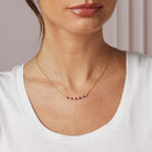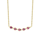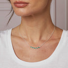 The necklace features a series of elegantly arranged teardrop-shaped semi-precious stones, linked in a flowing line and gently punctuated with crystal accents. Each stone is carefully framed to highlight its natural richness, with the smooth emerald chalcedony in the silver design offering a fresh, botanical vibrancy, while the garnet in the gold-plated design glows with warmth and depth. The arrangement creates a sense of continuity and balance, offering a look that is at once modern and romantic.
