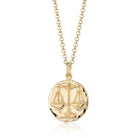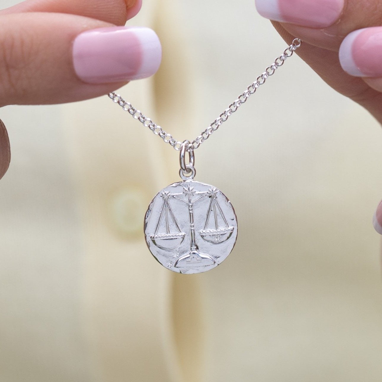 The pendant itself showcases an elegant and detailed depiction of two perfectly balanced scales, symbolising fairness, equality, and moral integrity; the core values that lie at the heart of Libra. Surrounding the scales are six of Libra’s brightest stars, meticulously engraved to mirror the beauty of the night sky, along with the instantly recognisable astrological glyph representing this air sign. The coin’s mottled edge lends a subtle vintage-inspired finish, reminiscent of ancient celestial coins, while the smooth reverse ensures comfort and balance when worn against the skin.