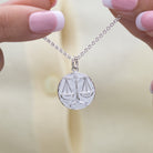 Our exquisite Scream Pretty Sterling Silver Libra Scales of Justice Necklace is a refined and meaningful piece of jewellery that beautifully encapsulates the elegance, harmony and equilibrium associated with the Libra zodiac sign. Exquisitely crafted from high-quality sterling silver, this sleek necklace features a round pendant coin intricately engraved with the Libra constellation and its defining symbol; the Scales of Justice.