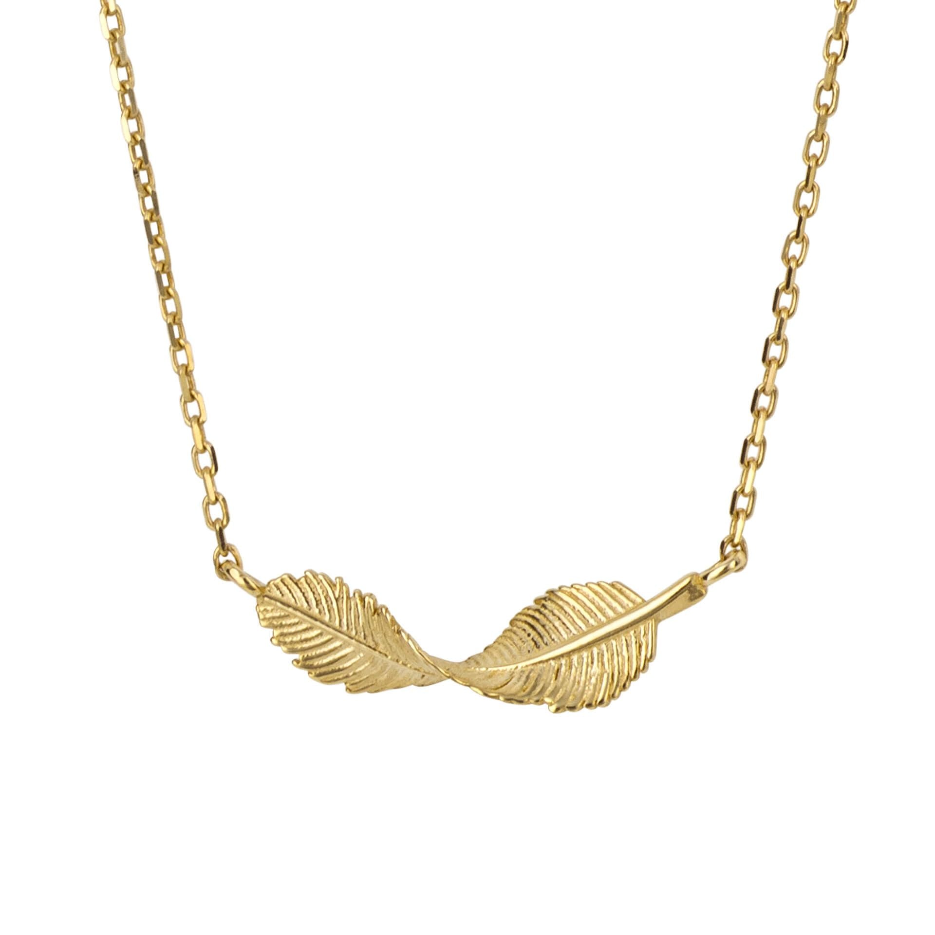 The design features a finely crafted gold chain, composed of small, evenly spaced, round links that create a soft, fluid texture and a graceful drape. Suspended at its centre lies an intricately designed pendant, delicately formed to resemble two intertwined leaves. Each leaf is beautifully detailed, with fine veins and subtle curvature, lending a sense of realism and organic charm. The leaves are connected at their tips in a three-dimensional twist, oriented in opposite directions to create a perfect balance of symmetry and flow. This nature-inspired motif captures both movement and harmony, while the polished gold surface reflects light, bestowing a subtle shimmer that elevates the piece’s sophistication.