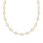 The necklace features a graceful chain adorned with evenly spaced quatrefoil stations, each finely crafted to form a symmetrical four-lobed silhouette. The openwork design gives the motif an airy, intricate quality, while the high-polished finish reflects light with understated brilliance. The chain itself is composed of small, interlinking round links that provide a subtle texture and fluid movement, ensuring that the necklace sits beautifully against the neckline. Every element has been thoughtfully balanced, creating a piece that is both striking and refined, ideal for elevating everyday wear or adding a touch of grace to evening attire.