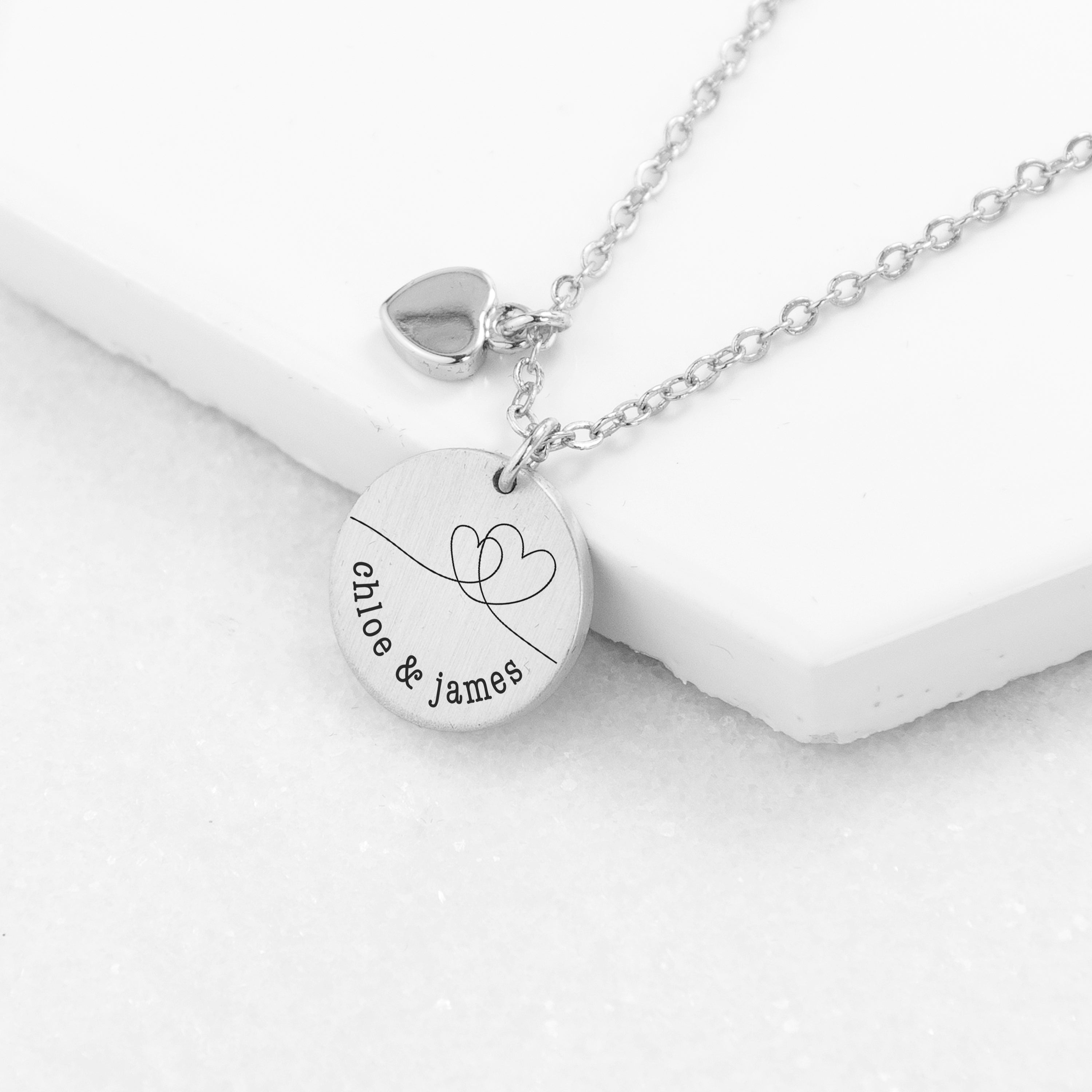 Featuring front and centre of the disc pendant is a romantic line art drawing of two intertwined hearts as well as an additional heart charm, this sweet necklace doubles up on the love and is the perfect way to carry a reminder of your partner wherever you go.