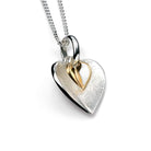 Our exquisite Sterling Silver and Gold Double Heart Pendant Necklace is a radiant symbol of love and connection. Meticulously crafted with exceptional artistry, this beautiful piece of jewellery features two heart pendants, one in lustrous sterling silver and the other in warm, polished gold. The larger heart, formed in sleek sterling silver, showcases a subtle satin-brushed texture. Nestled gracefully within it rests a smaller golden heart, delicately sculpted with smooth contours and a mirror-like shine. Together, the two hearts create a harmonious contrast of tones and finishes, representing the unity of two souls intertwined in love and affection.