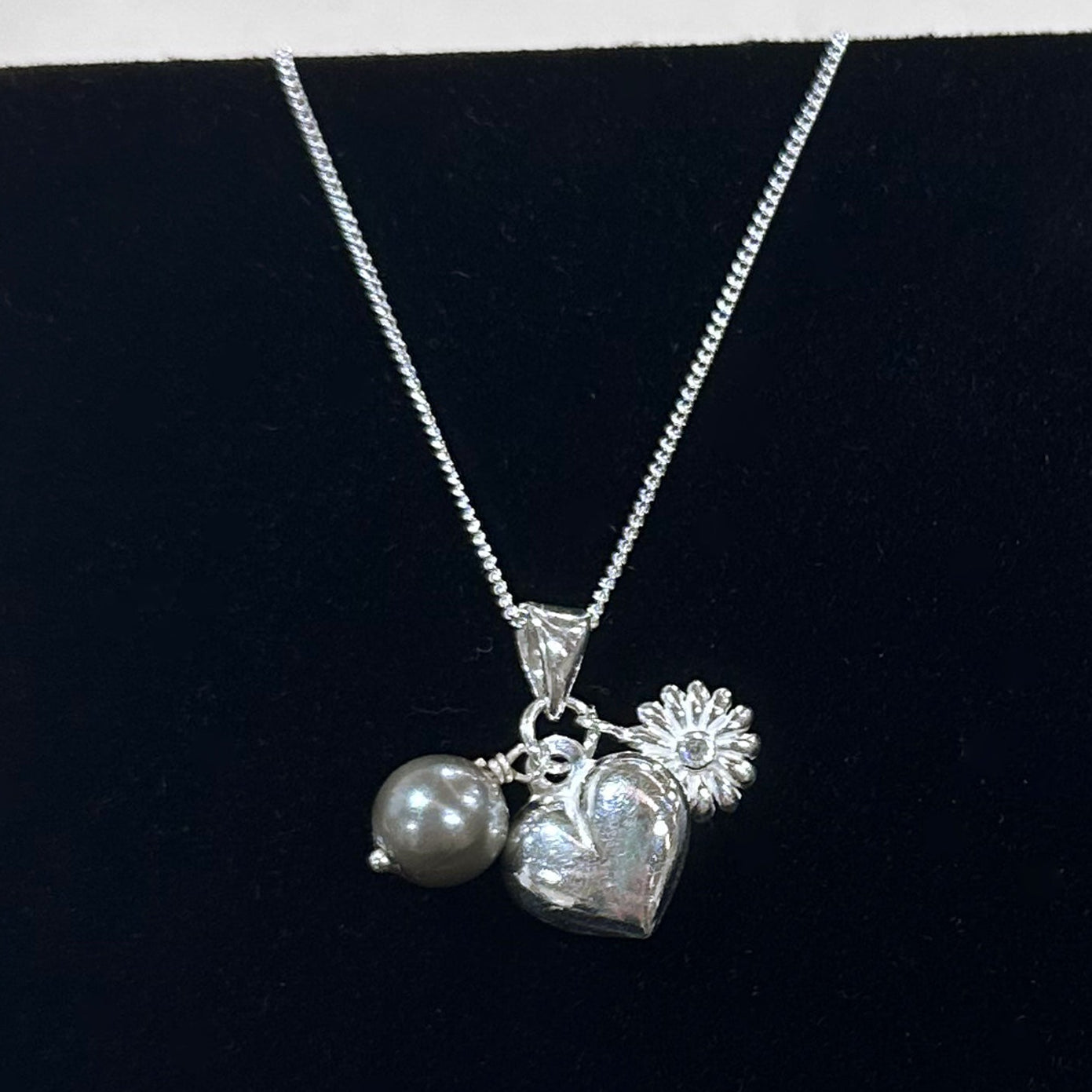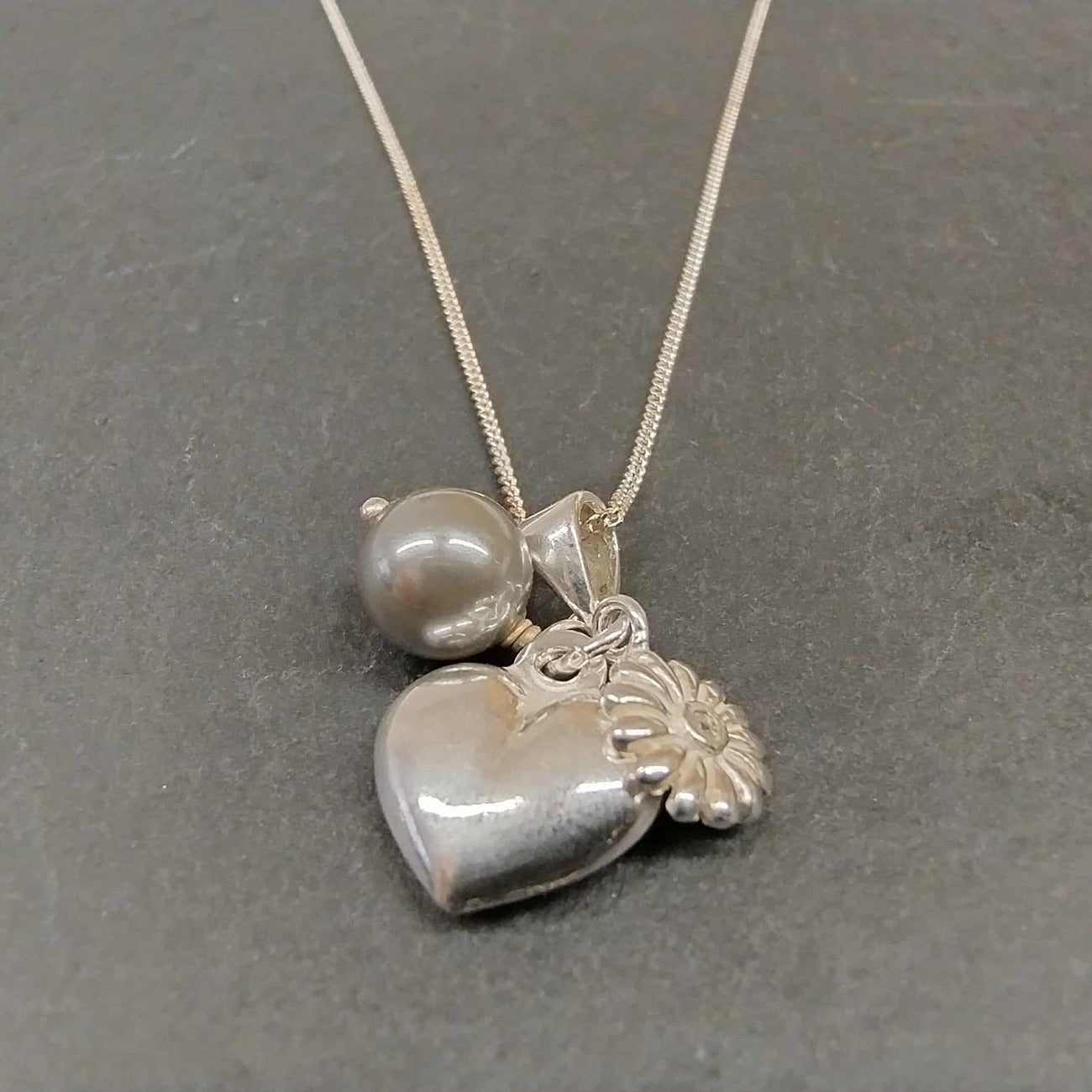 The final charm is a flower-shaped motif, beautifully detailed with multiple soft petals radiating around a small, round central element. Flowers are symbolic of growth, new beginnings and the beauty of nature, while their delicate form evokes a sense of femininity and elegance. This particular charm brings a touch of lightness and joy to the piece, balancing the romantic symbolism of the heart with the serene elegance of the pearl-like charm.