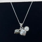 Suspended from the chain are three exquisite charms, each with its own unique form and symbolism. The first charm is a round, dark-coloured, pearl-like sphere featuring a subtle indentation at the top. This delicate detail gives the charm a natural and organic quality, reminiscent of a lustrous freshwater pearl. Symbolically, pearls have long been associated with wisdom, purity, and emotional balance, making this charm a meaningful emblem of inner beauty and grace.