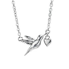 Suspended on a classic sterling silver chain, the design balances simplicity with sophistication, making it a versatile adornment that can complement both casual daytime outfits and refined evening wear. The hummingbird charm is intricately detailed yet retains a soft, smooth contour, lending a sense of vitality to the necklace. The accompanying heart adds a touch of warmth and intimacy, transforming the piece into a keepsake to treasure.