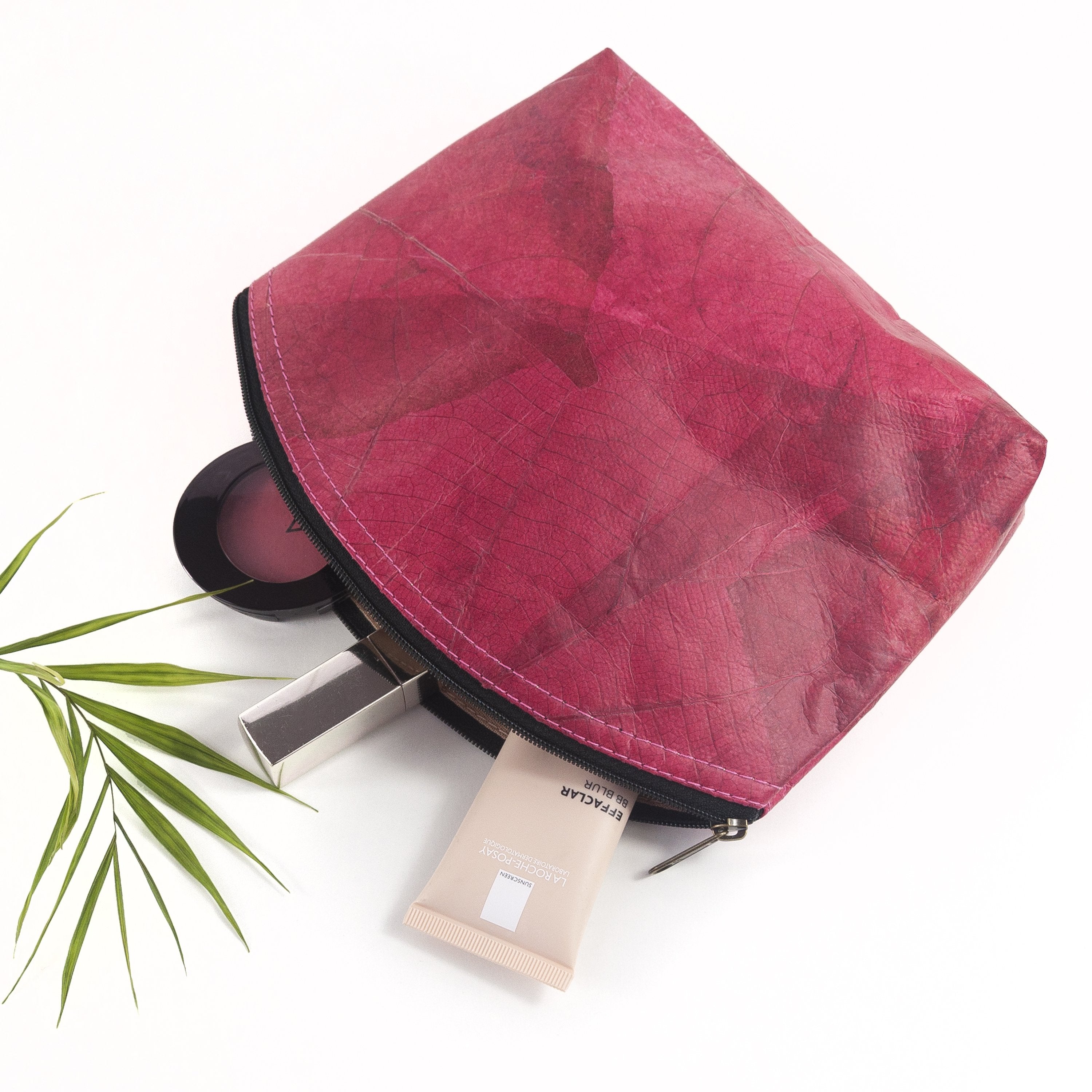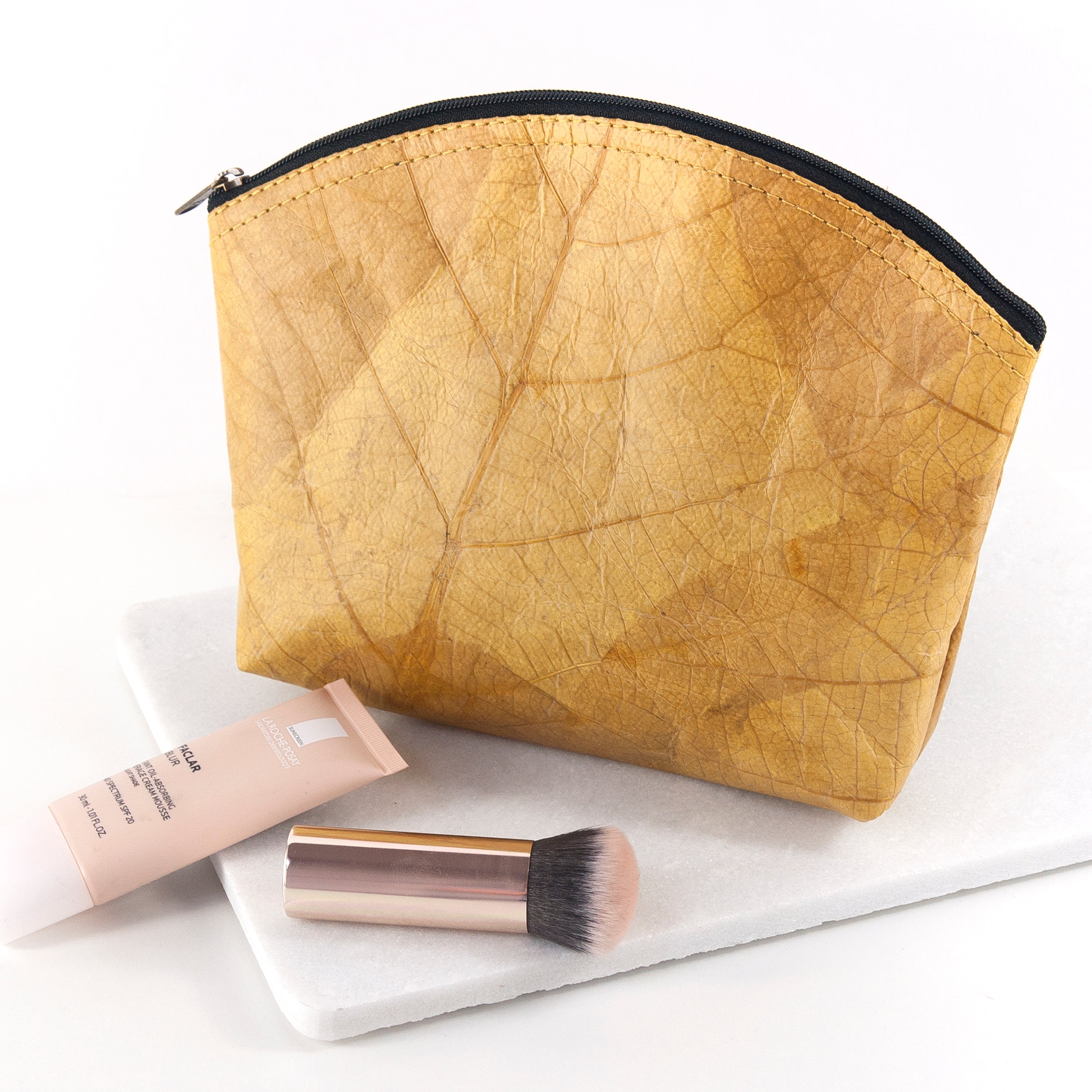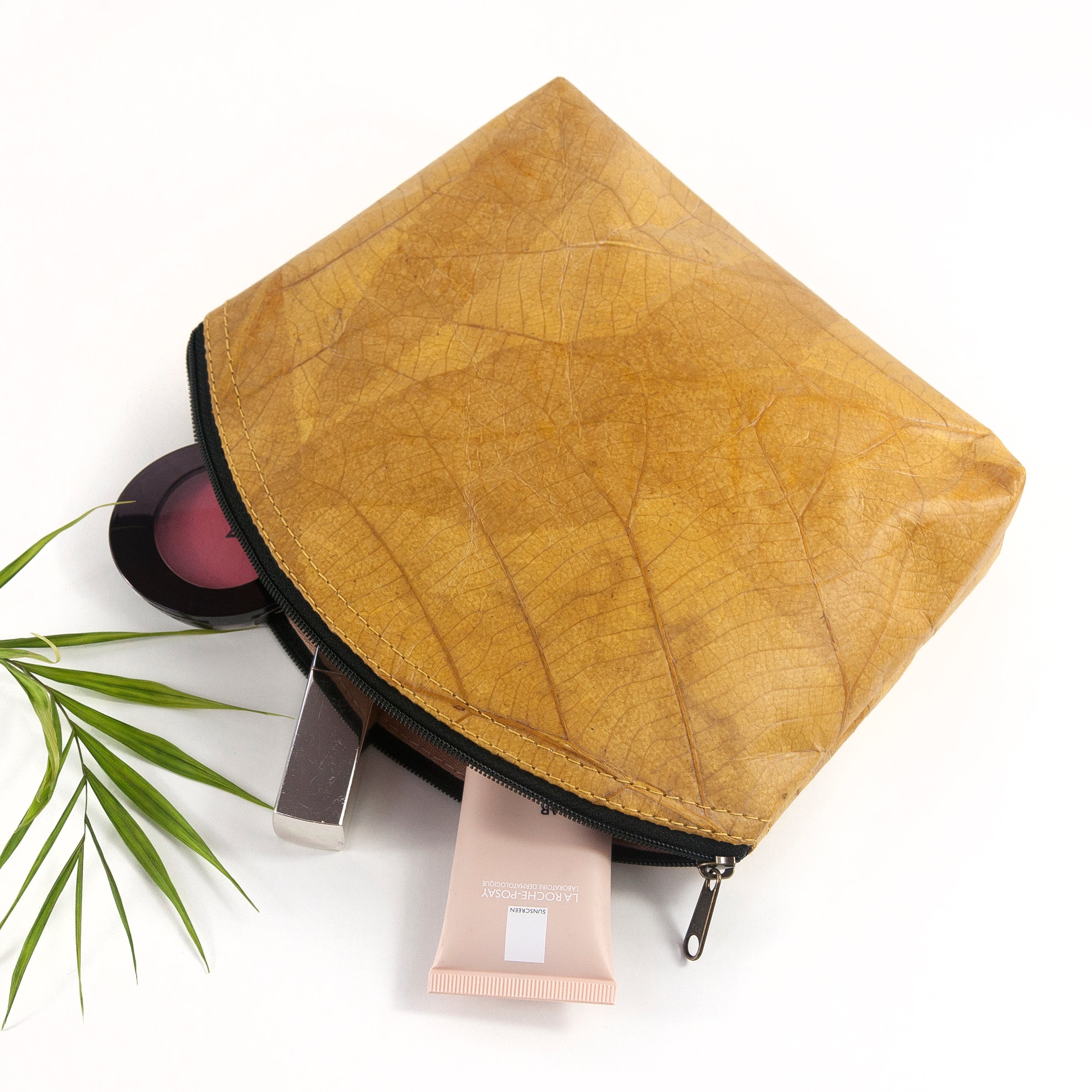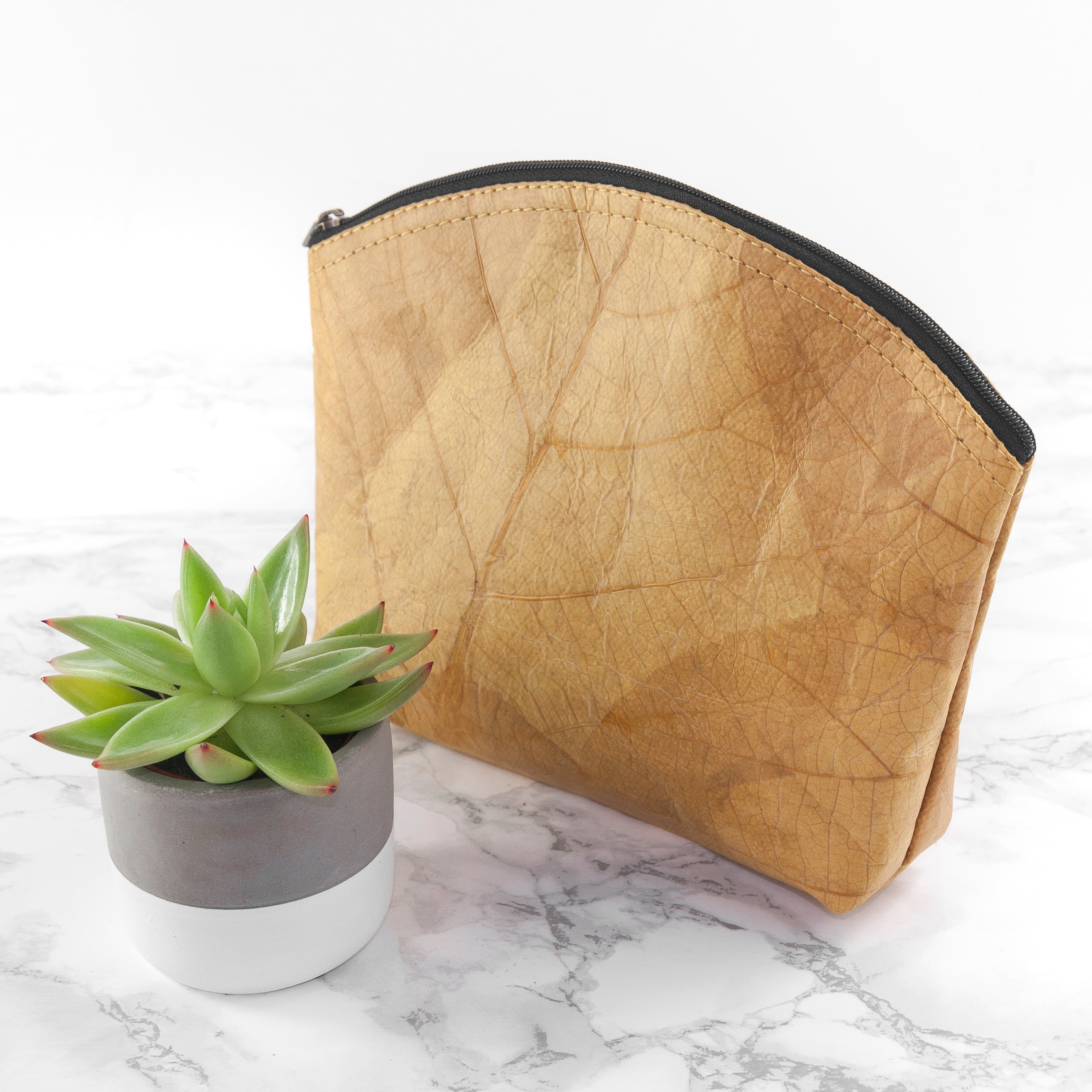 Leaf leather is sustainably harvested from fallen leaves, which have been dried and naturally dyed. The natural variations in textures and patterns are to be expected and are part of what makes every make up bag a one-of-a-kind gift your loved one will adore. All our products are vegan and sustainably produced and handmade locally to the highest quality and finished by our specialist craftsman.