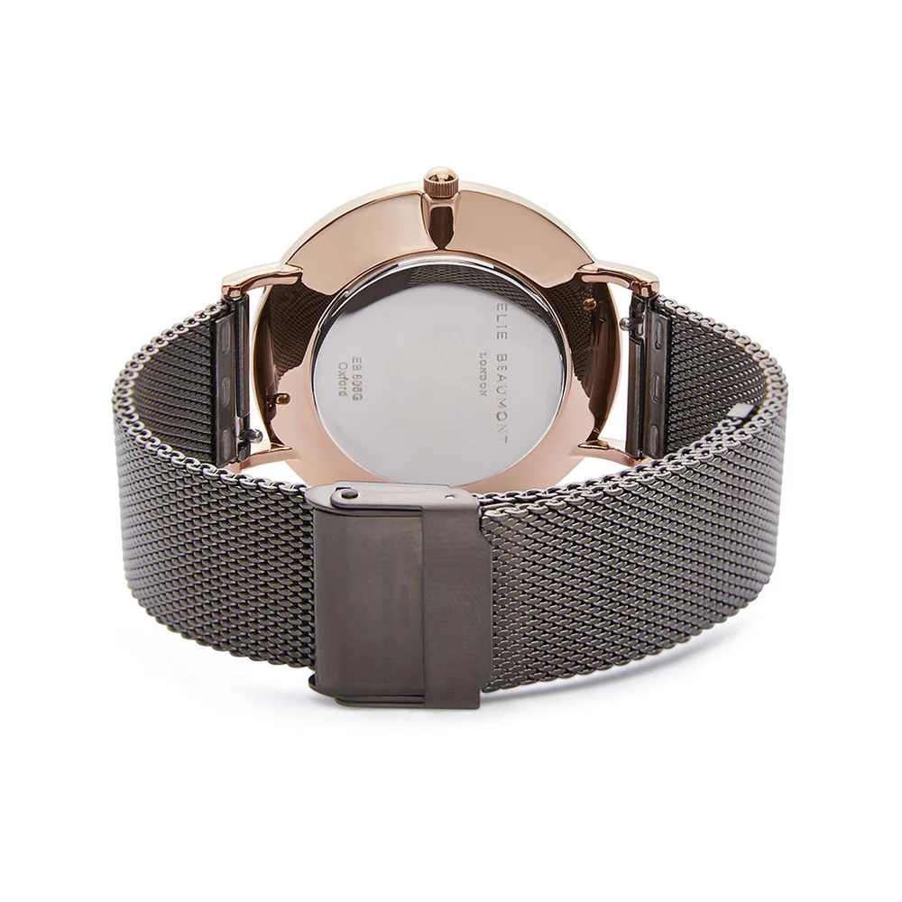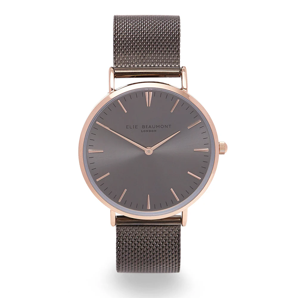 The gorgeous Elie Beaumont Oxford dial with mesh bracelets, a contemporary twist on a classic tale. With a gorgeous mesh strap in gun metal and a classic large 38mm rose gold dial with a stunning metallic finish this watch certainly makes a statement.