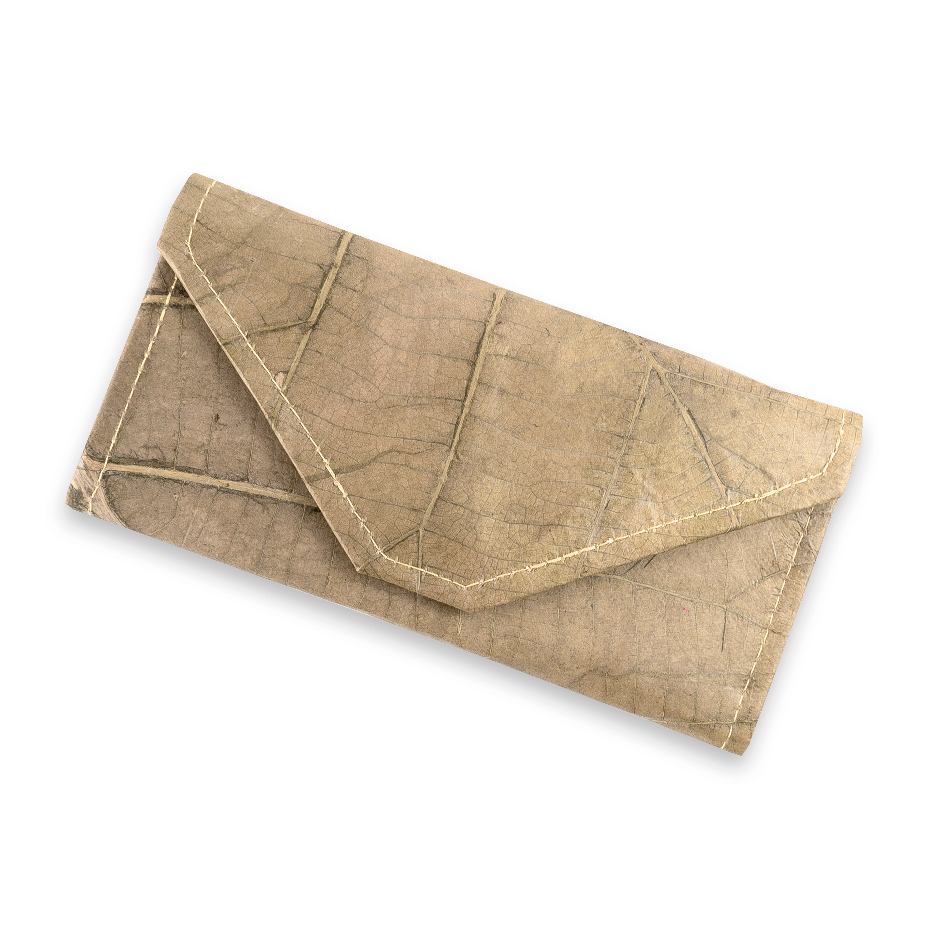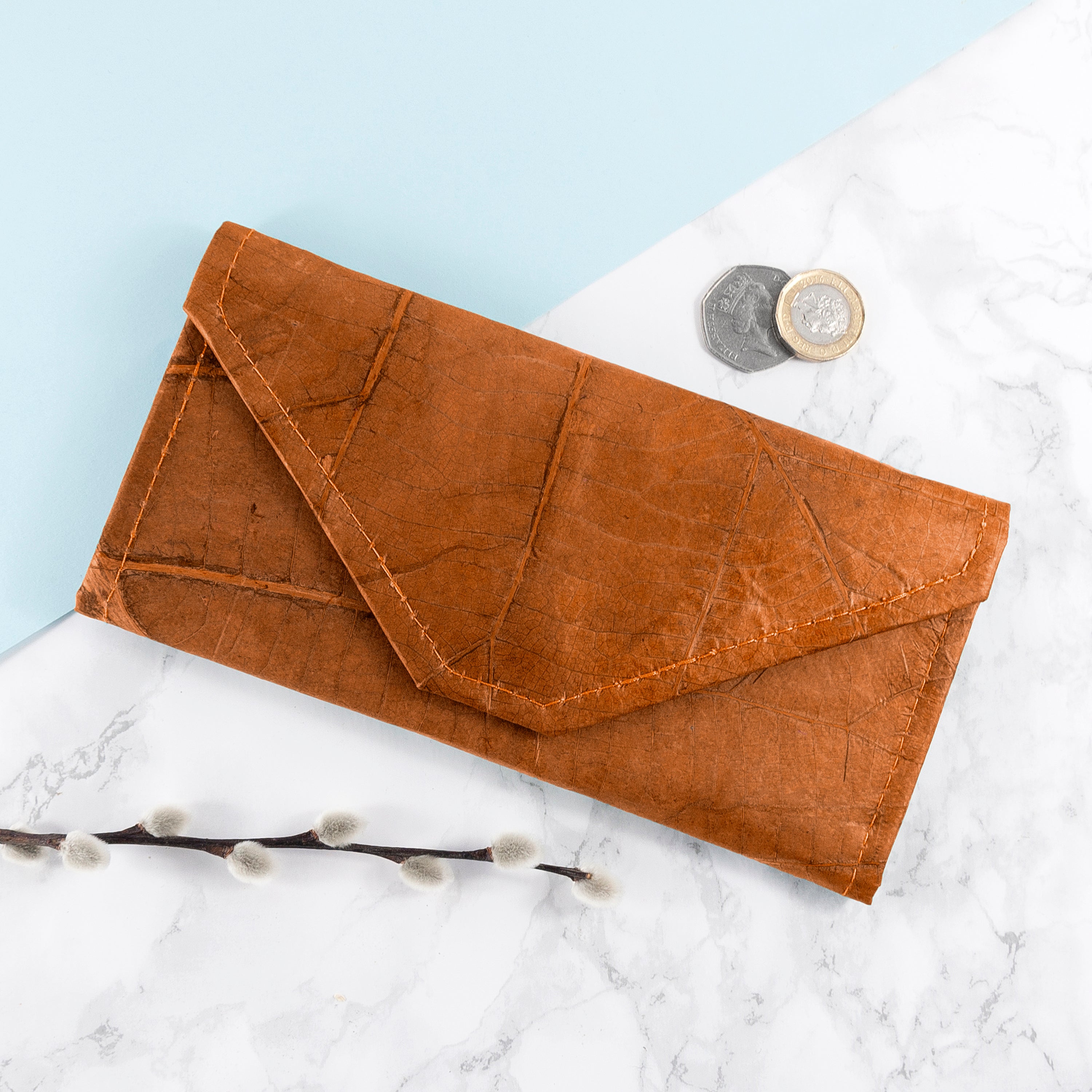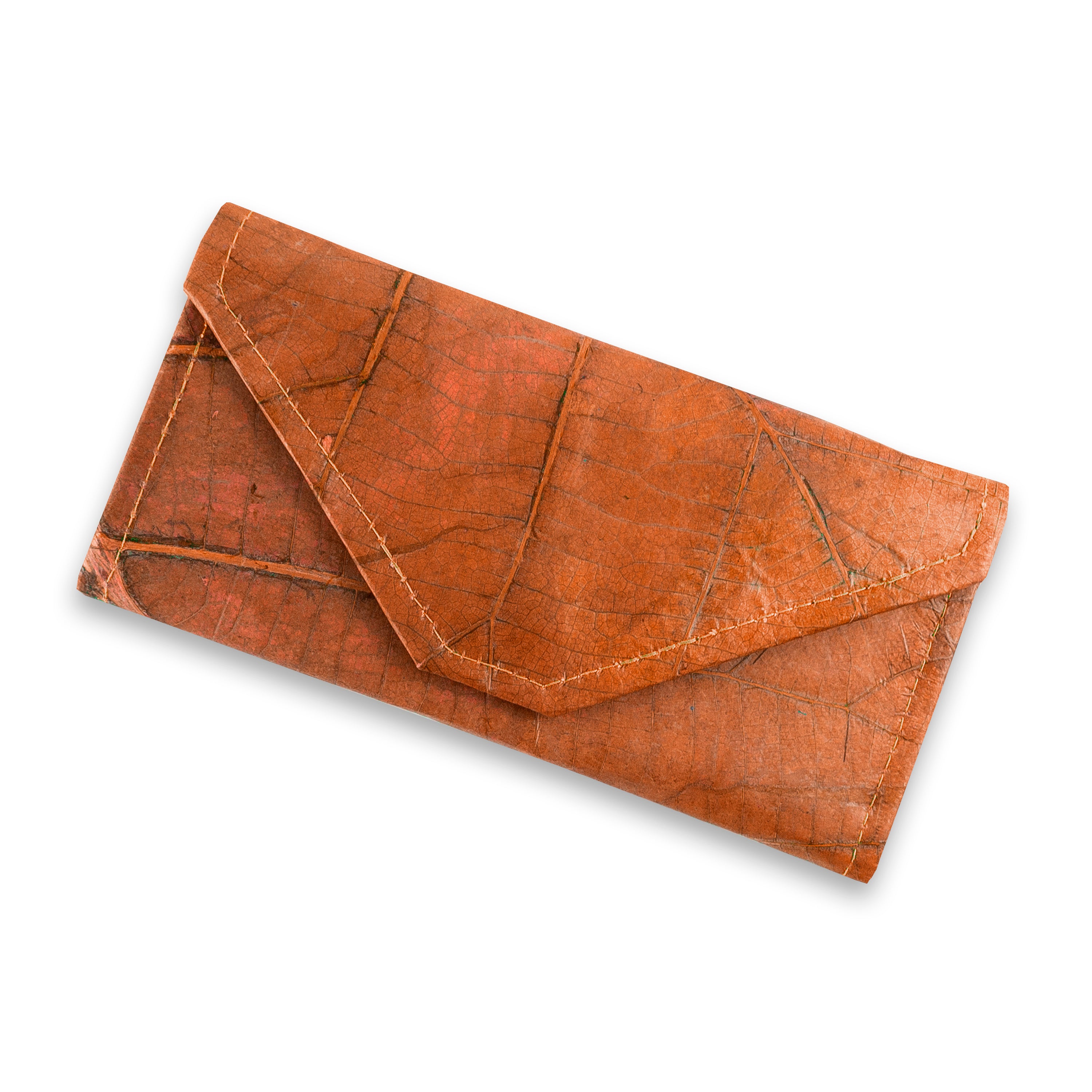 Our wallets are made from leaf leather, a vegan and cruelty-free alternative to leather made from teak leaves. The leaves are sustainably harvested before being dried, coloured with natural dyes, and sealed with a resin to preserve them. It’s this process that ensures our leaf leather is durable and eco-friendly.