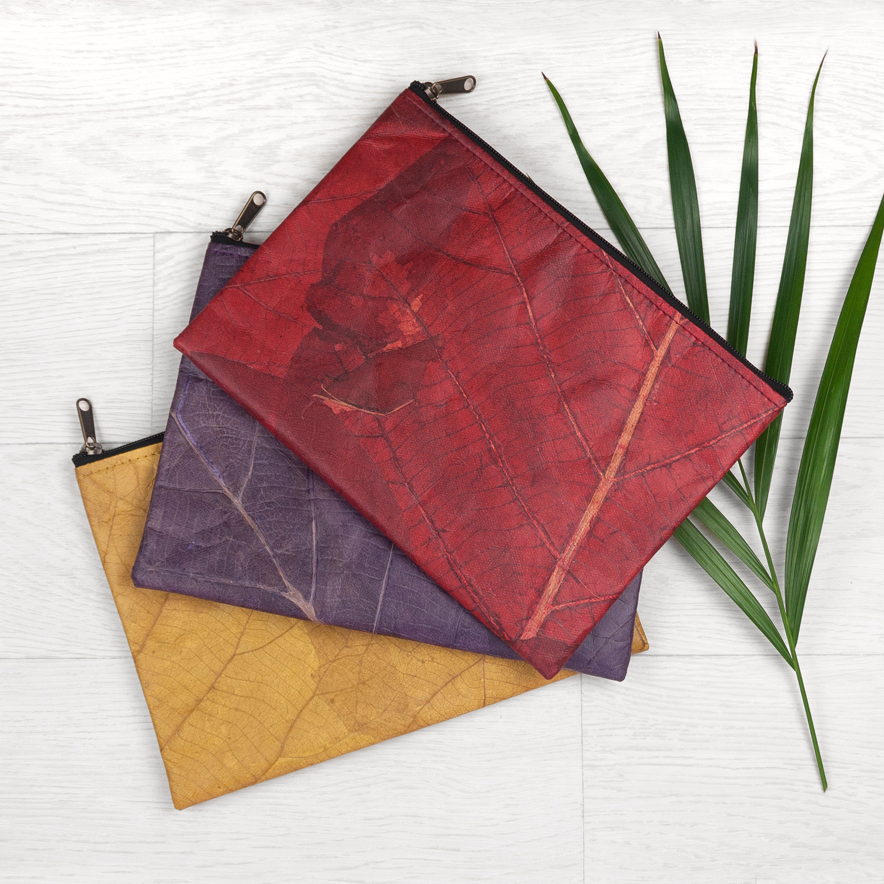 Our leaf leather is a cruelty-free, vegan alternative to leather, made from sustainably harvested teak leaves. The leaves are collected, dried and dyed with natural colours, then coated with a natural resin to preserve them and make them into the leather we use in our products.
