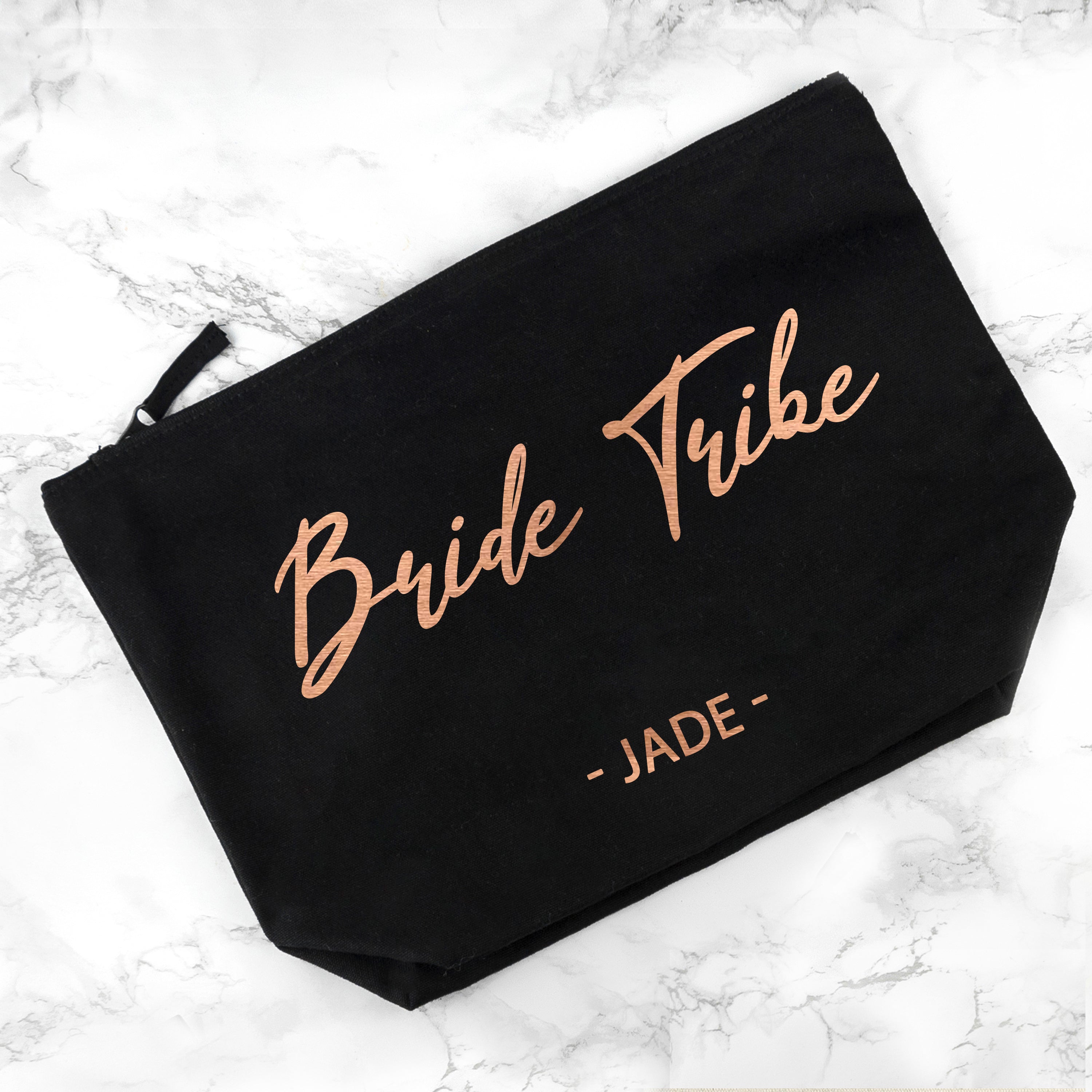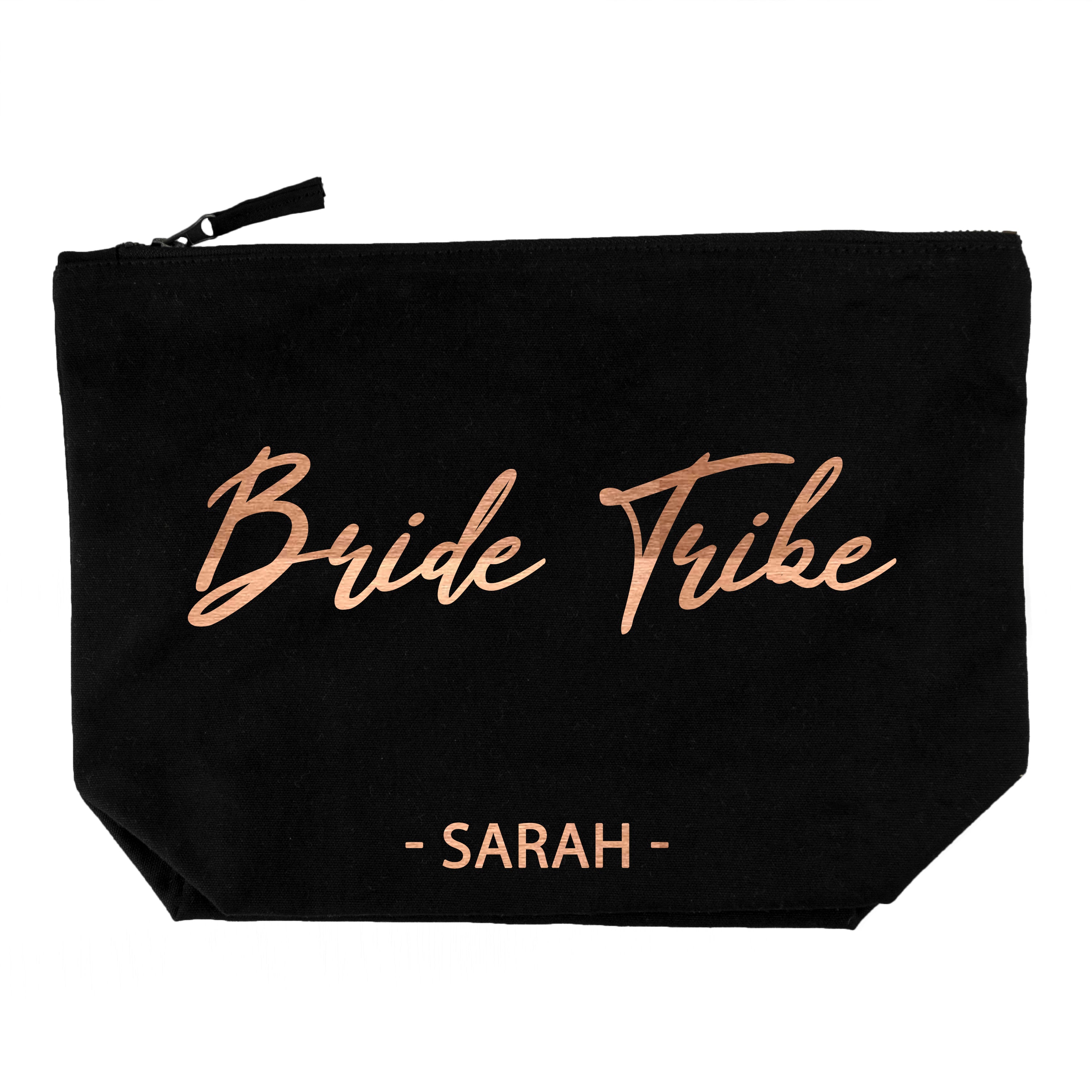 Our gorgeous personalised black cosmetic bag will come with 'Bride Tribe' in a script font to celebrate the vital contribution they made to making your big day special in rose gold. Their name will be printed underneath in a beautiful type font.
