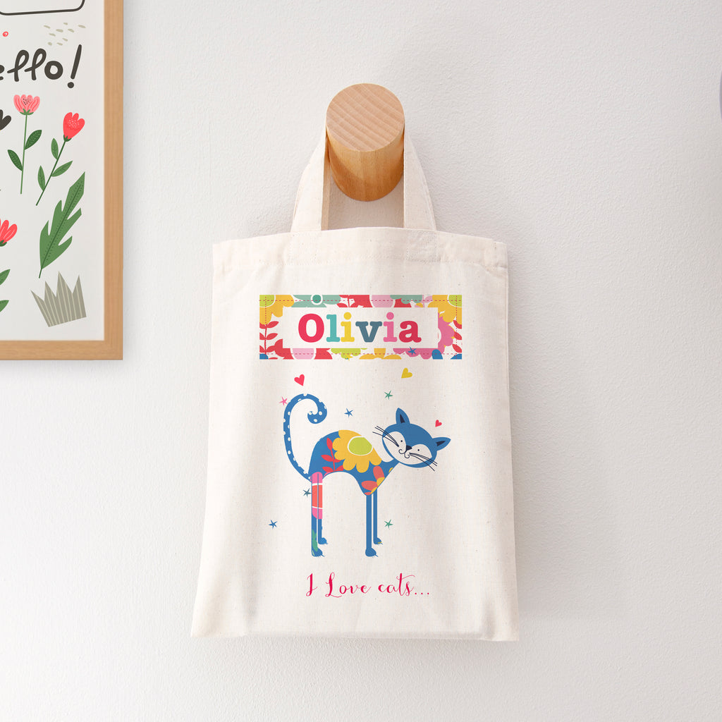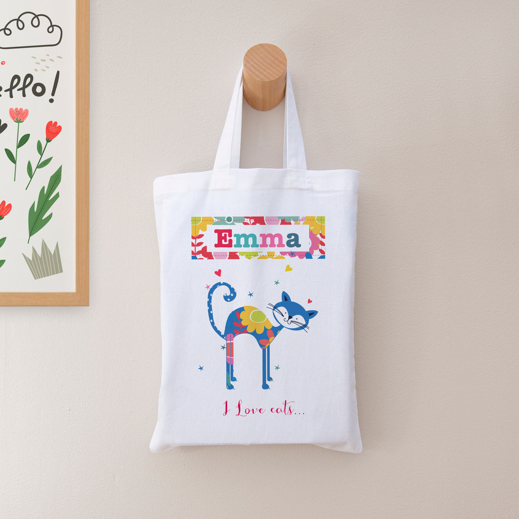 Personalise with your loved one’s name and it’ll be placed prominently at the top of this design in a floral box with a super cute image of a cat underneath on a starry background. ‘I Love Cats’ will be written at the bottom of their mini tote bag in a red script style font, adding a touch of playfulness to any occasion.