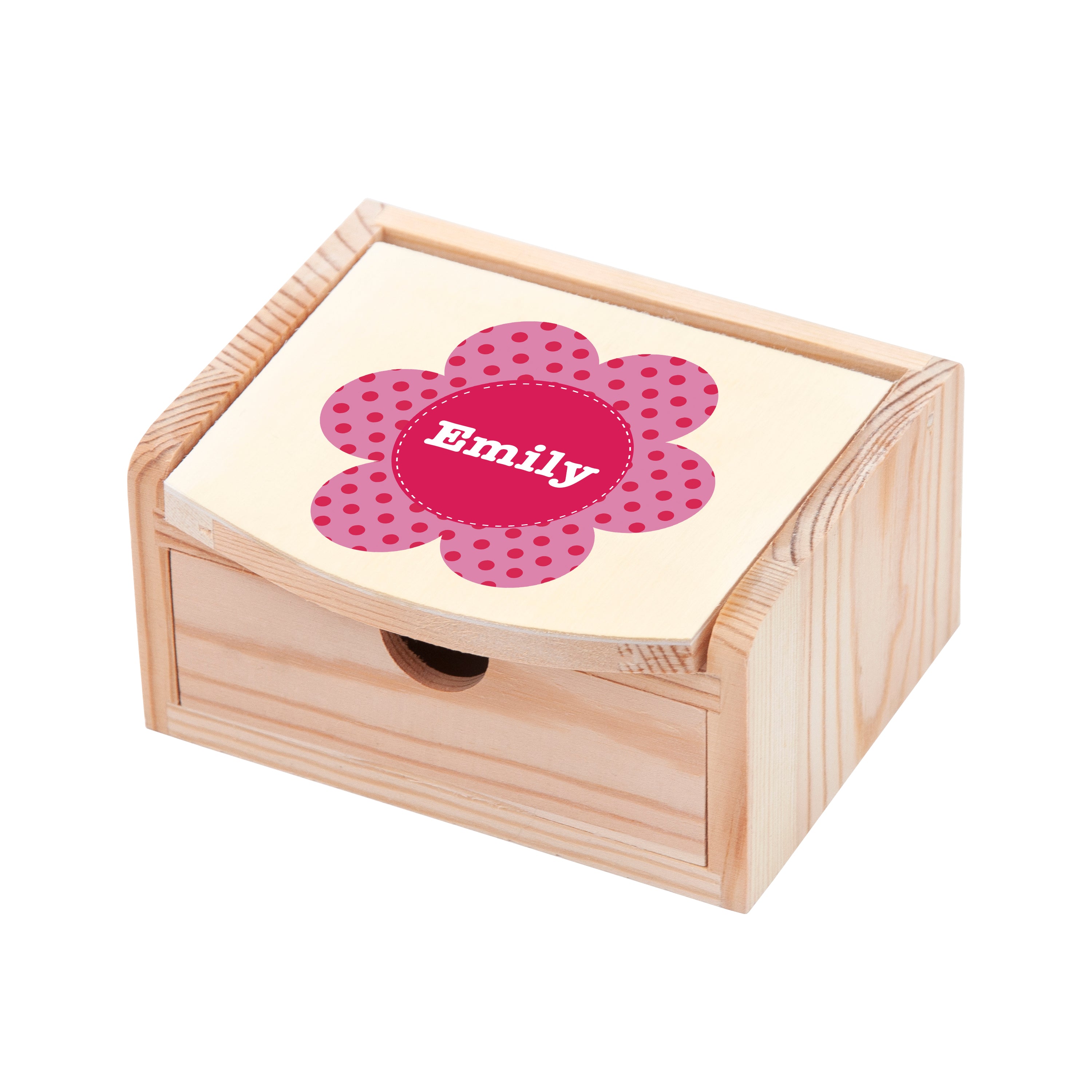 Our beautifully crafted personalised kid’s flower jewellery box is designed with a charming and vibrant pink flower motif, capturing the imagination of every young heart who sees it. The perfect size for all her accessory essentials, it’s intricate detailing and vibrant colour makes it a captivating addition to her room that she's bound to show off whenever she has friends over.