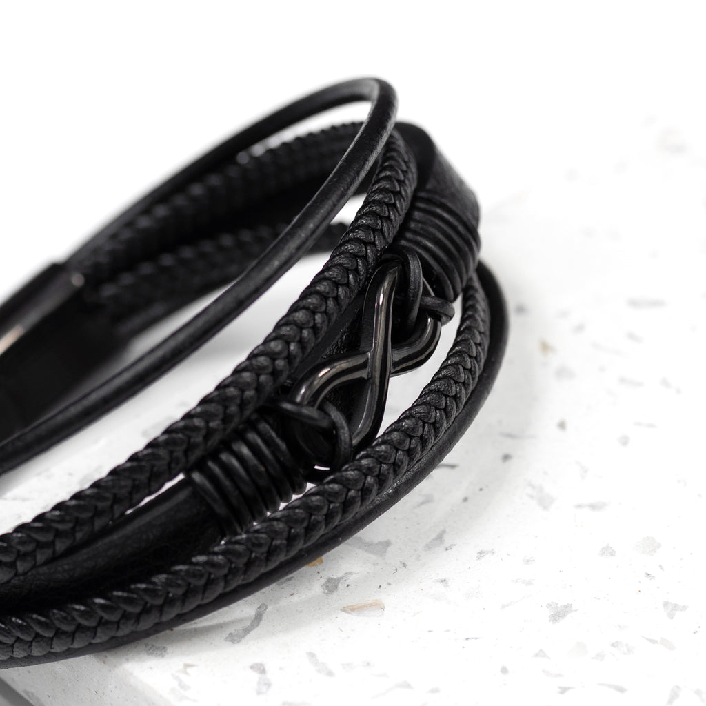 This leather stacked bracelet features a sleek infinity design prominently displayed for all to see - symbolising the enduring and undying bond of love and friendship between you and him. Meanwhile, the timeless black hue adds a touch of allure and versatility, effortlessly complementing any outfit, whether it's a refined evening attire or a casual, laid-back ensemble.