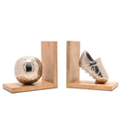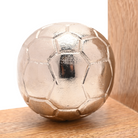 What truly sets this pair apart is its striking football inspired detailing. On one bookend rests a beautifully rendered silver tone football, its polished surface subtly reflective and intricately patterned to echo the familiar panels of a classic ball. It sits neatly cradled against the wooden frame, creating a pleasing contrast between the cool metallic finish and the warmth of the timber. On the opposing bookend, a matching football boot, also silver in colour, is captured mid-motion, angled as though poised to strike. The sculptural quality of the boot, with its defined contours and textured detailing, brings a sense of movement and energy to the piece, evoking the passion and dynamism of the game.