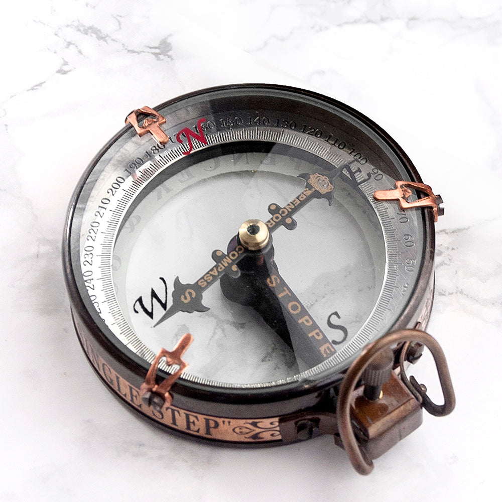 Our exquisite vintage style compass features a luxury copper feel finish with the phrase "A thousand mile journey begins with a single step." It also features a bejewelled bearing and a bow on the south facing side.