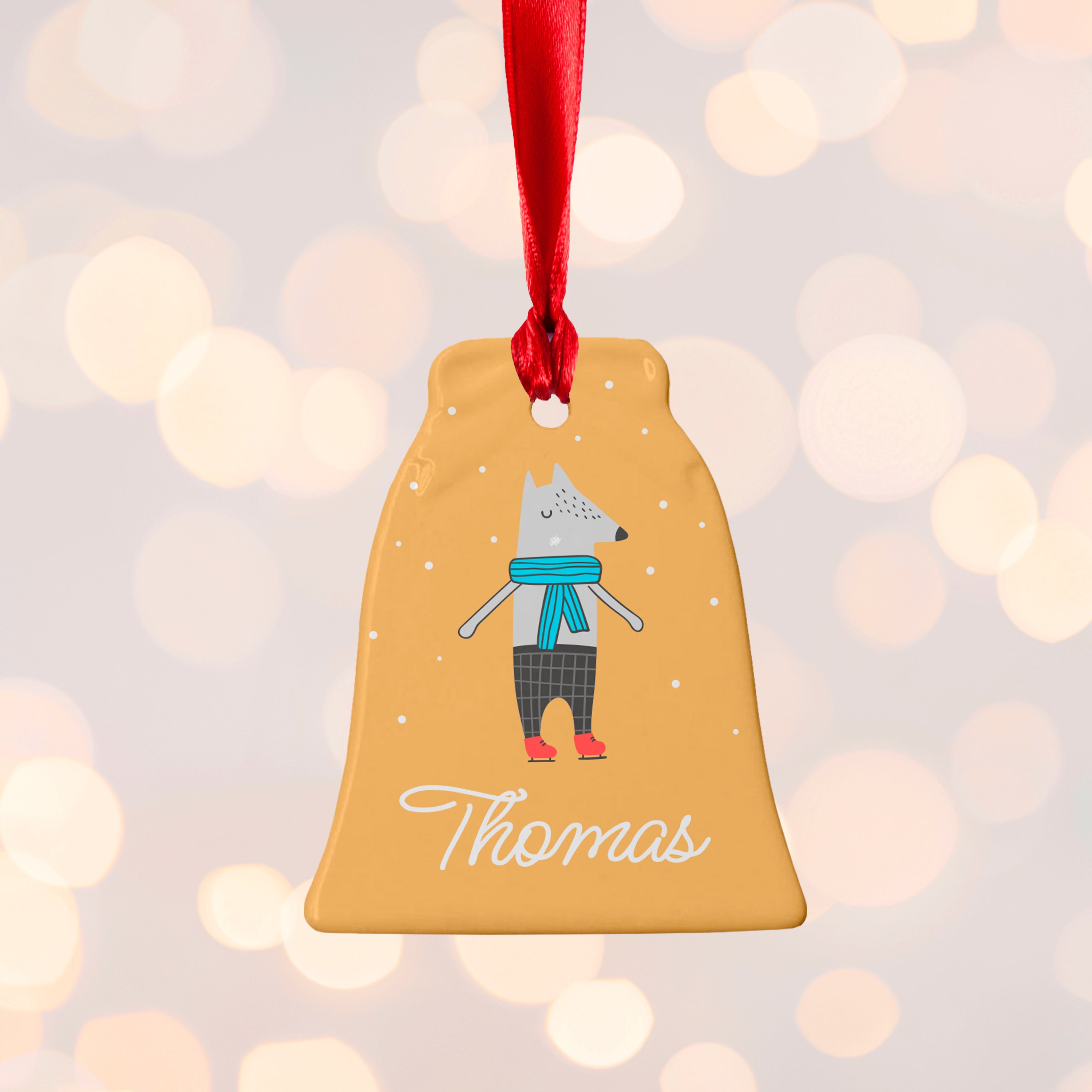 This stunning Christmas decorative piece features a cute fox dress in warm winter clothes, ready to go ice skating on a snowy day. Underneath this beautiful image will come your loved one’s name in a white script style font which beautifully contrasts the dark yellow background.