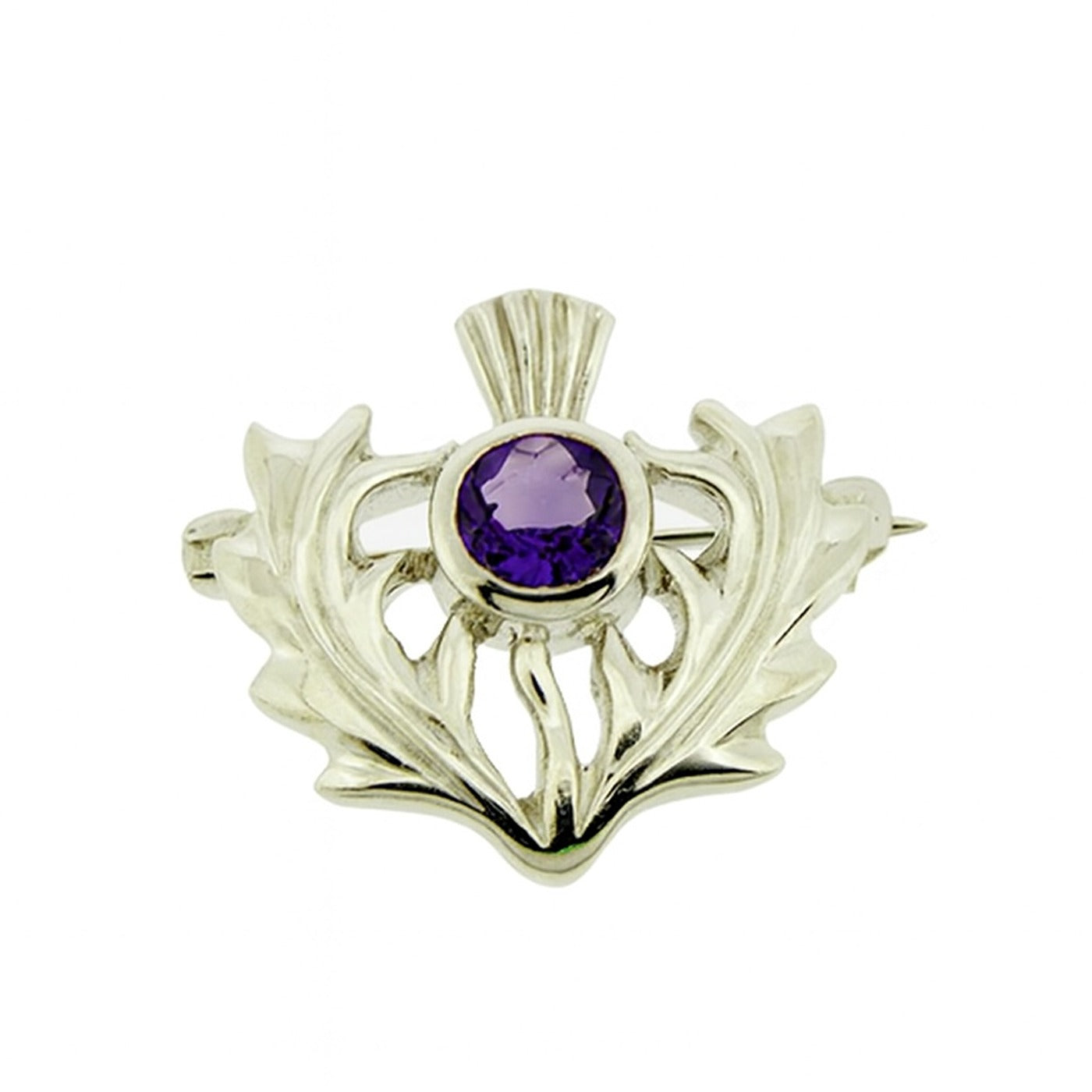 The brooch is expertly crafted from sterling silver, shaped into the form of a stylised thistle, with sweeping leaves that curve in an elegant, symmetrical composition. Each leaf displays soft contours and delicate ridges, mirroring the natural texture of the thistle plant. At the heart of the design sits a striking round-cut amethyst crystal, its deep violet hue lending a captivating contrast against the cool silver tones. The stone is faceted to enhance its reflective brilliance, catching the light with every movement. The pin mechanism at the back is discreet and secure, allowing the brooch to sit gracefully on a lapel, scarf coat or bag, making it a versatile accessory for both everyday elegance and special occasions.