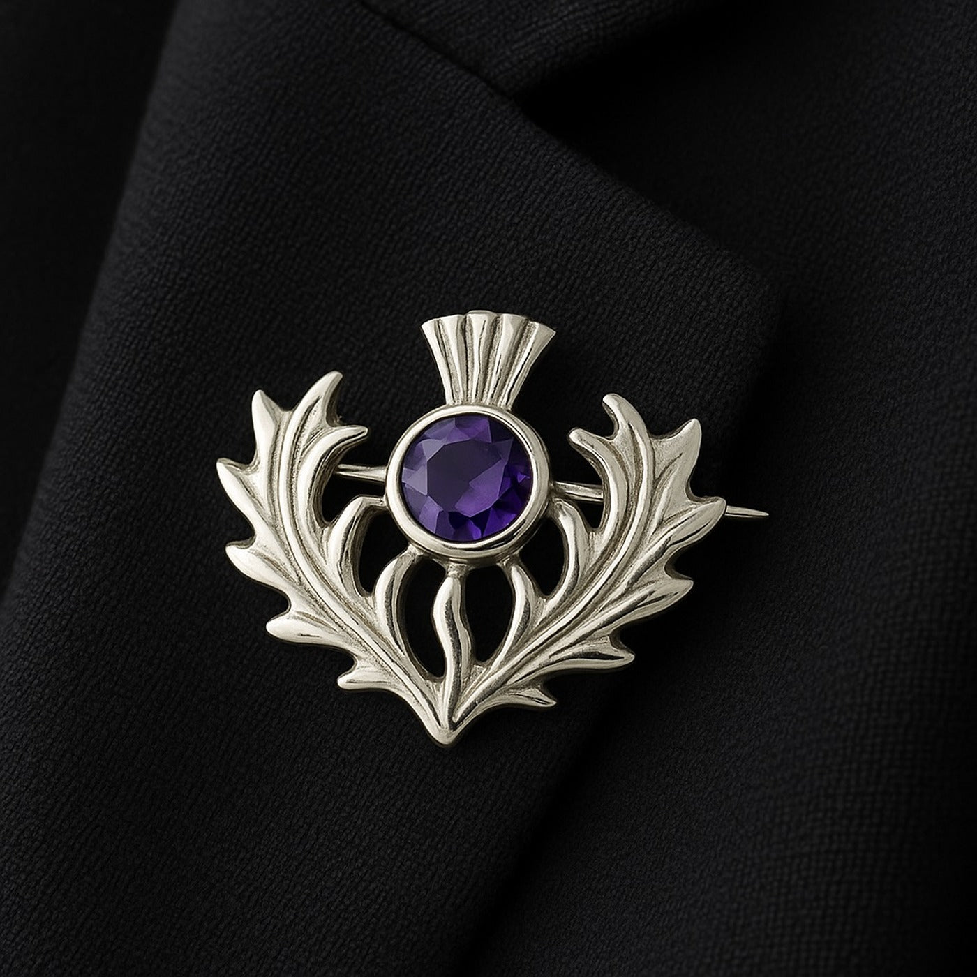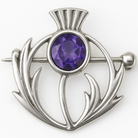 The thistle holds rich symbolism, particularly within Scottish culture, where it is revered as a national emblem. Historically associated with resilience, bravery and nobility, the thistle is said to represent protection and enduring strength, its beauty matched by its natural ability to defend itself. In a symbolic sense, to give a thistle is to acknowledge someone’s courage and steadfastness, while also celebrating their grace. The amethyst crystal further enhances this meaning, as the stone is traditionally linked with clarity, inner calm and heartfelt sentiment. Together, the silver thistle and violet crystal convey a message of admiration, loyalty and affection, making this brooch an especially meaningful gift for her.