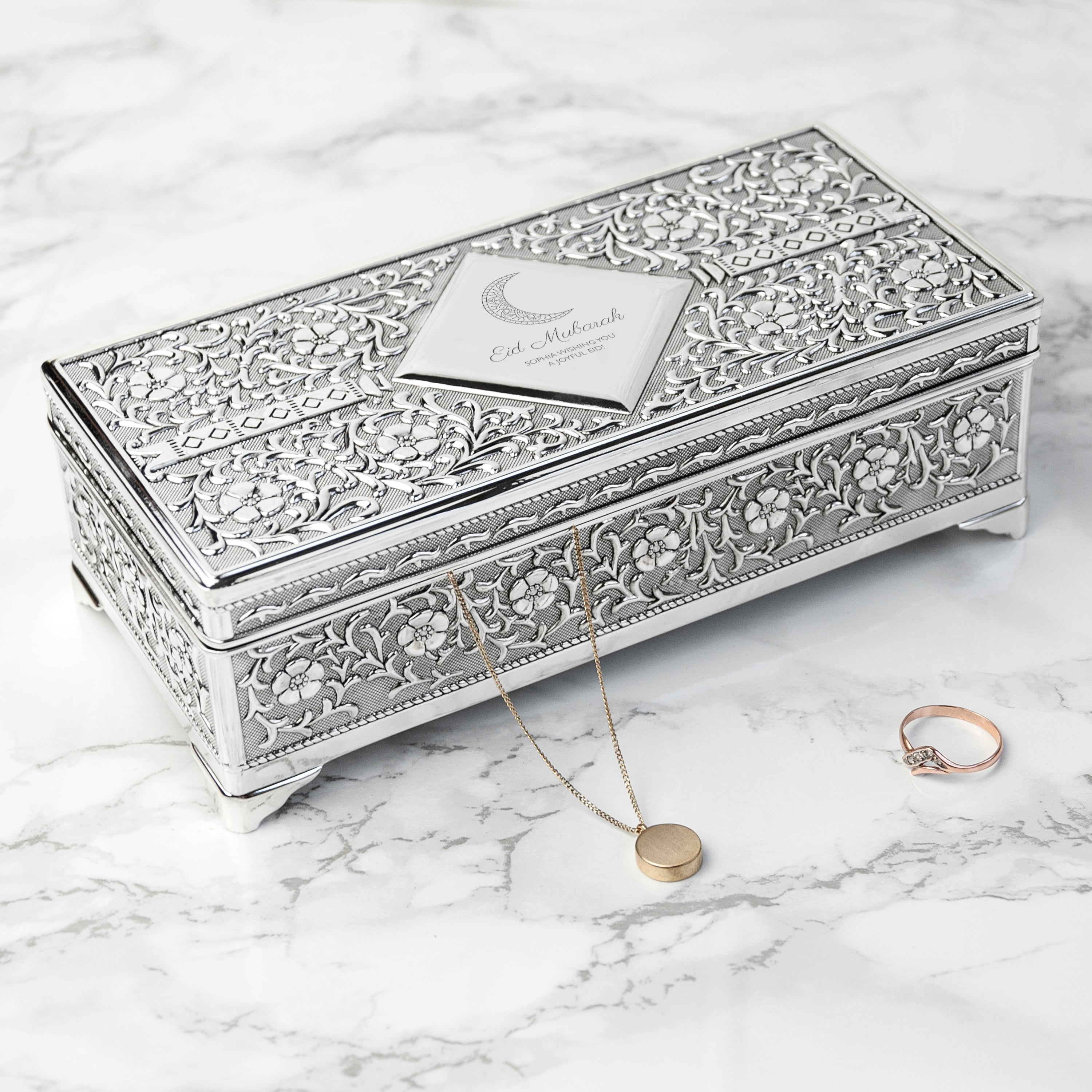 A beautiful addition to her dressing table, this ornate personalised Eid Mubarak Jewellery Trinket box is the perfect place to store her most precious jewellery safely and securely, whilst also being a symbol of your undying love and pride all that she has become. The ideal Eid Mubarak gift to send her good wishes and show her how much she means to you.