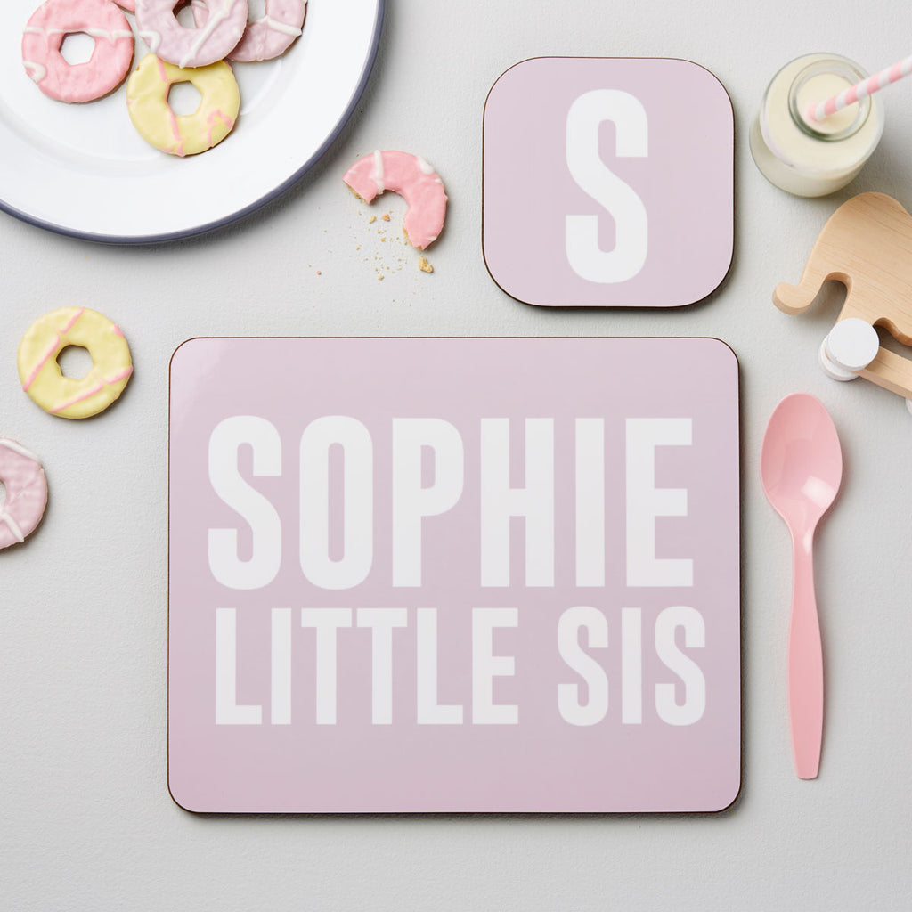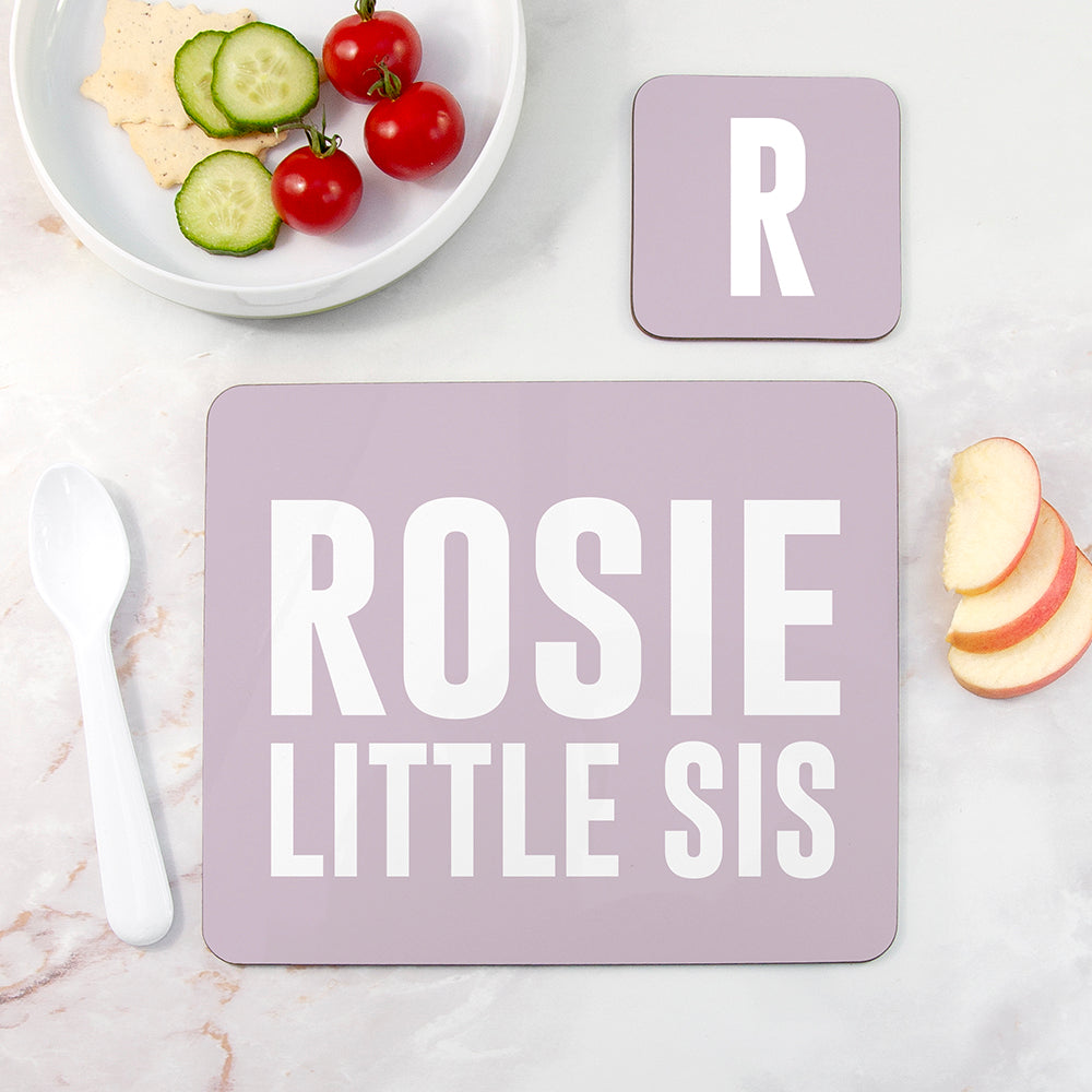 This placemat set features a placemat and coaster, both with a pink background. On the coaster will be an initial (the first letter of the name you place in the personalisation box). Meanwhile, on the placemat, your loved one’s name, along with your choice of ‘big sis’ or ‘little sis’, will be written in bold white capital letters. Our dedicated personalisation will work their magic, creating a memorable gift that will quickly become a dinnertime staple.