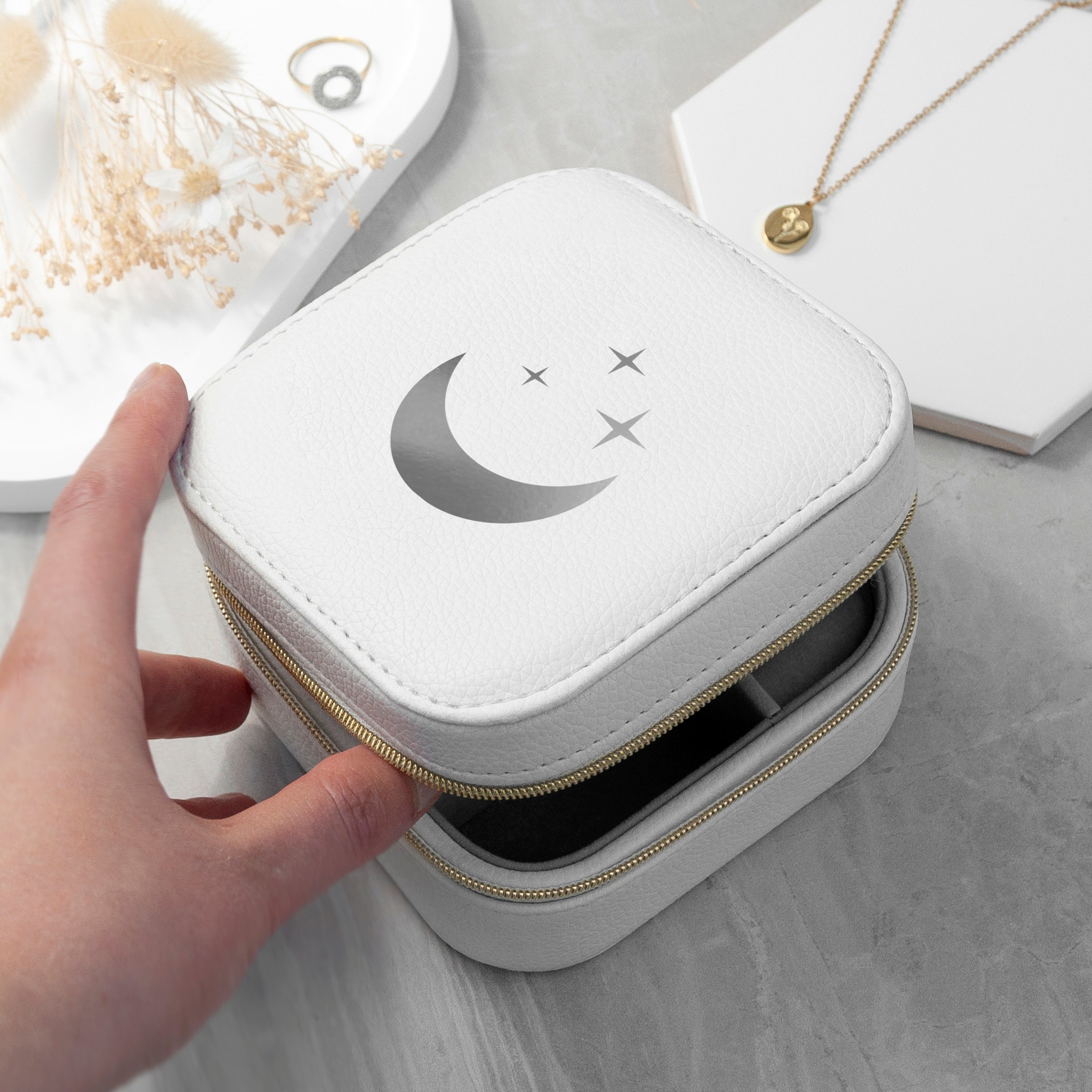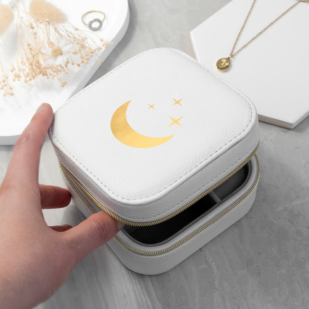 Delight her with the enchanting elegance of our stunning Moon and Stars White Travel Jewellery Case, a perfect gift for birthdays, Christmas, or any special occasion. This compact and stylish jewellery case features a sleek white exterior adorned with a beautiful moon and star design, evoking the magic of a starlit night, adding a touch of celestial charm to whichever room it is kept in and wherever it goes.