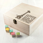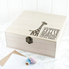 Engraved pine wood keepsake box with giraffe design and clip close clasp.