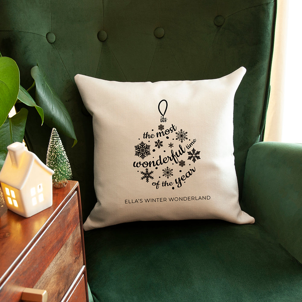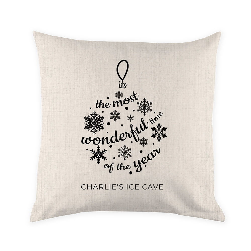 This stunning cushion cover is adorned with a delightful bauble design incorporating the standard text ‘it’s the most wonderful time of the year’.